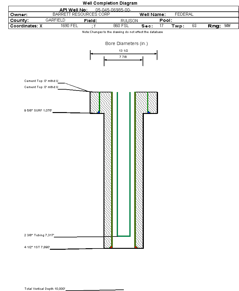 | Wellbore Completed | | Completion Date: | 6/2/1999 | | Spud Date: | 5/8/1999 | Spud Date Is: | ACTUAL | | Measured TD: | 7896 ft. | Measured PB depth: | 0 ft. | | True Vertical TD: | 0 ft. | True Vertical PB depth: | | | Casing: | String Type: SURF, Hole Size: 13.5 in., Size: 9.625 in., Top: 0 ft., Depth: 1076 ft., Weight: , Citings Type: HISTORICAL | | Cement: | Sacks: 530, Top: 0 ft., Bottom: , Determination Method: | | Casing: | String Type: 1ST, Hole Size: 7.875 in., Size: 4.5 in., Top: 0 ft., Depth: 7890 ft., Weight: , Citings Type: HISTORICAL | | Cement: | Sacks: 0, Top: 0 ft., Bottom: , Determination Method: | | Formation | Interval Top | Log Bottom | Cored | DSTs | | WASATCH F | 1974 ft. | | | | | MESAVERDE | 4435 ft. | | | | | CAMEO COAL | 7135 ft. | | | |