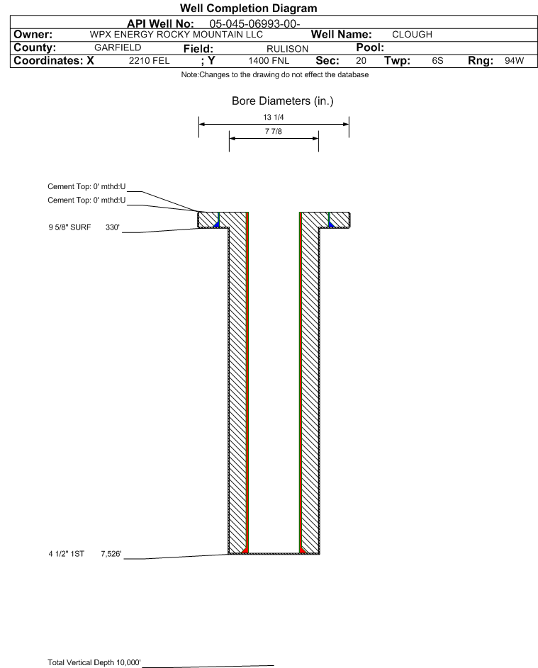 | Wellbore Completed | | Completion Date: | 9/15/1995 | | Measured TD: | 7540 ft. | Measured PB depth: | 0 ft. | | True Vertical TD: | 0 ft. | True Vertical PB depth: | | | Casing: | String Type: SURF, Hole Size: 13.25 in., Size: 9.625 in., Top: 0 ft., Depth: 330 ft., Weight: , Citings Type: HISTORICAL | | Cement: | Sacks: 150, Top: 0 ft., Bottom: , Determination Method: | | Casing: | String Type: 1ST, Hole Size: 7.875 in., Size: 4.5 in., Top: 0 ft., Depth: 7526 ft., Weight: , Citings Type: HISTORICAL | | Cement: | Sacks: 0, Top: 0 ft., Bottom: , Determination Method: | | Formation | Interval Top | Log Bottom | Cored | DSTs | | MESAVERDE | 4354 ft. | | | | | CAMEO COAL | 7010 ft. | | | |