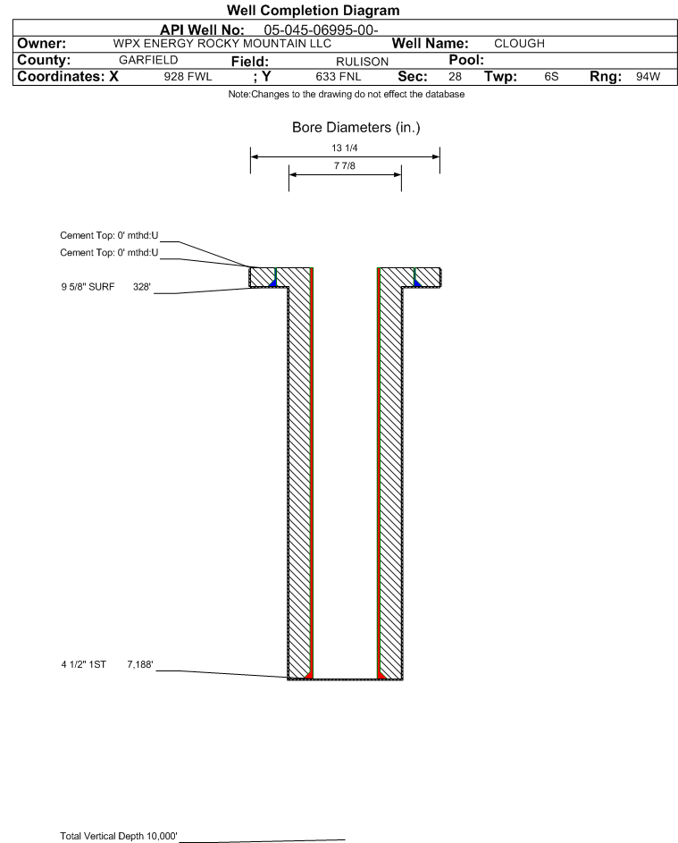 | Wellbore Completed | | Completion Date: | 9/5/1995 | | Measured TD: | 7200 ft. | Measured PB depth: | 0 ft. | | True Vertical TD: | 0 ft. | True Vertical PB depth: | | | Casing: | String Type: SURF, Hole Size: 13.25 in., Size: 9.625 in., Top: 0 ft., Depth: 328 ft., Weight: , Citings Type: HISTORICAL | | Cement: | Sacks: 150, Top: 0 ft., Bottom: , Determination Method: | | Casing: | String Type: 1ST, Hole Size: 7.875 in., Size: 4.5 in., Top: 0 ft., Depth: 7188 ft., Weight: , Citings Type: HISTORICAL | | Cement: | Sacks: 0, Top: 0 ft., Bottom: , Determination Method: | | Formation | Interval Top | Log Bottom | Cored | DSTs | | MESAVERDE | 3938 ft. | | | | | CAMEO COAL | 6690 ft. | | | |