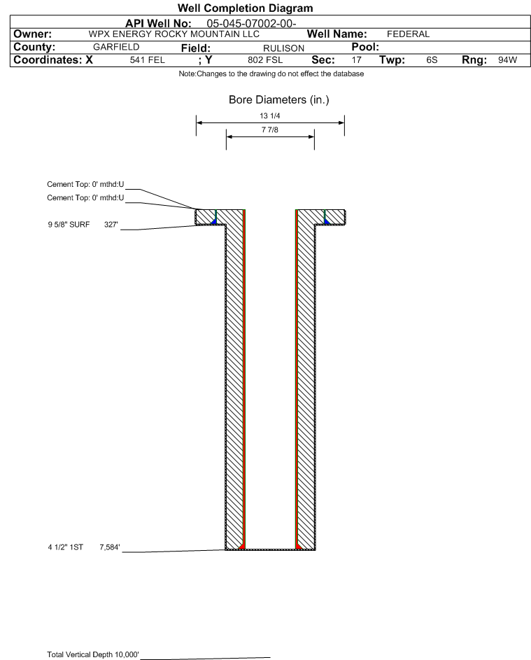 | Wellbore Completed | | Completion Date: | 1/9/1996 | | Measured TD: | 7600 ft. | Measured PB depth: | 0 ft. | | True Vertical TD: | 0 ft. | True Vertical PB depth: | | | Casing: | String Type: SURF, Hole Size: 13.25 in., Size: 9.625 in., Top: 0 ft., Depth: 327 ft., Weight: , Citings Type: HISTORICAL | | Cement: | Sacks: 150, Top: 0 ft., Bottom: , Determination Method: | | Casing: | String Type: 1ST, Hole Size: 7.875 in., Size: 4.5 in., Top: 0 ft., Depth: 7584 ft., Weight: , Citings Type: HISTORICAL | | Cement: | Sacks: 0, Top: 0 ft., Bottom: , Determination Method: | | Formation | Interval Top | Log Bottom | Cored | DSTs | | MESAVERDE | 4240 ft. | | | | | CAMEO COAL | 7085 ft. | | | |
