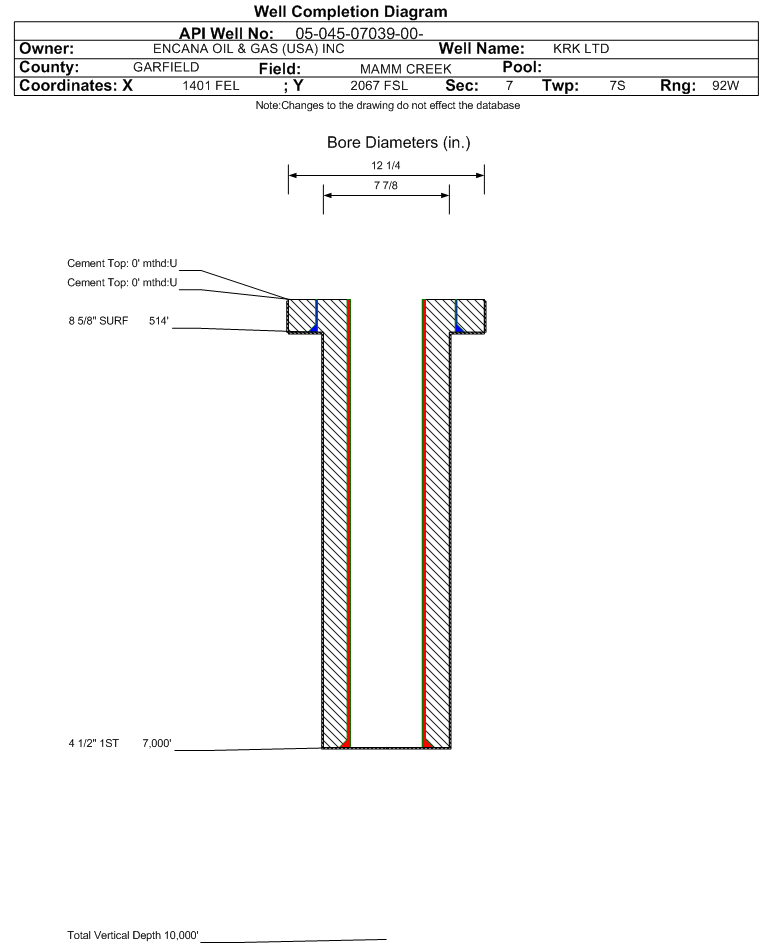 | Wellbore Completed | | Completion Date: | 2/3/1996 | | Measured TD: | 7000 ft. | Measured PB depth: | 6880 ft. | | True Vertical TD: | 0 ft. | True Vertical PB depth: | | | Casing: | String Type: SURF, Hole Size: 12.25 in., Size: 8.625 in., Top: 0 ft., Depth: 514 ft., Weight: , Citings Type: HISTORICAL | | Cement: | Sacks: 350, Top: 0 ft., Bottom: , Determination Method: | | Casing: | String Type: 1ST, Hole Size: 7.875 in., Size: 4.5 in., Top: 0 ft., Depth: 7000 ft., Weight: , Citings Type: HISTORICAL | | Cement: | Sacks: 0, Top: 0 ft., Bottom: , Determination Method: | | Formation | Interval Top | Log Bottom | Cored | DSTs | | OHIO CREEK | 2909 ft. | | | | | CAMEO | 6574 ft. | | | | | ROLLINS | 6876 ft. | | | |