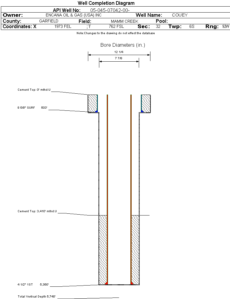 | Wellbore Completed | | Completion Date: | 2/17/2004 | | Spud Date: | 1/25/2004 | Spud Date Is: | ACTUAL | | Measured TD: | 5740 ft. | Measured PB depth: | 5250 ft. | | True Vertical TD: | | True Vertical PB depth: | | | Log Types: | DIL / GR / LDT / CNL / GR / CAL / CBL | | Casing: | String Type: SURF, Hole Size: 12.25 in., Size: 8.625 in., Top: , Depth: 503 ft., Weight: 24 , Citings Type: ACTUAL | | Cement: | Sacks: 350, Top: , Bottom: 503 ft., Determination Method: CBL | | Casing: | String Type: 1ST, Hole Size: 7.875 in., Size: 4.5 in., Top: , Depth: 5360 ft., Weight: 11.6 , Citings Type: ACTUAL | | Cement: | Sacks: 640, Top: 3410 ft., Bottom: 5360 ft., Determination Method: CALC | | Formation | Interval Top | Log Bottom | Cored | DSTs | | WASATCH | 0 ft. | 3203 ft. | N | N | | OHIO CREEK | 2845 ft. | | | | | WILLIAMS FORK | 3204 ft. | 5740 ft. | N | N |