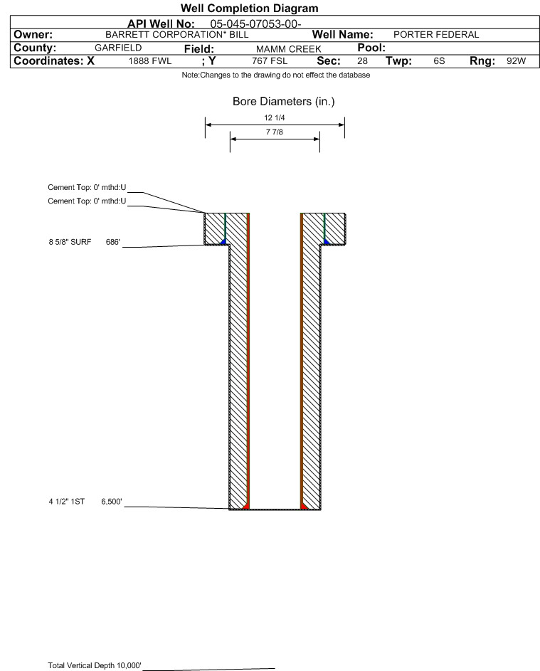 | Wellbore Completed | | Completion Date: | 8/9/1996 | | Measured TD: | 6510 ft. | Measured PB depth: | 6454 ft. | | True Vertical TD: | 0 ft. | True Vertical PB depth: | | | Casing: | String Type: SURF, Hole Size: 12.25 in., Size: 8.625 in., Top: 0 ft., Depth: 686 ft., Weight: , Citings Type: HISTORICAL | | Cement: | Sacks: 385, Top: 0 ft., Bottom: , Determination Method: | | Casing: | String Type: 1ST, Hole Size: 7.875 in., Size: 4.5 in., Top: 0 ft., Depth: 6500 ft., Weight: , Citings Type: HISTORICAL | | Cement: | Sacks: 0, Top: 0 ft., Bottom: , Determination Method: | | Formation | Interval Top | Log Bottom | Cored | DSTs | | OHIO CREEK | 3203 ft. | | | | | WILLIAMS FORK | 3361 ft. | | | |