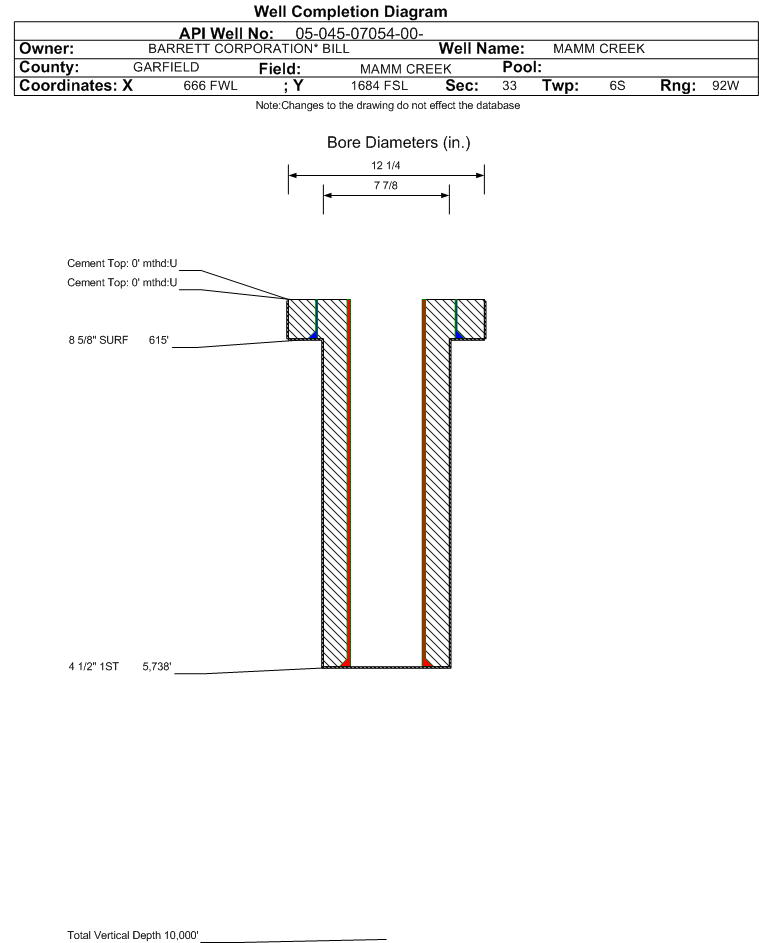 | Wellbore Completed | | Completion Date: | 6/12/1996 | | Measured TD: | 5738 ft. | Measured PB depth: | 5708 ft. | | True Vertical TD: | 0 ft. | True Vertical PB depth: | | | Casing: | String Type: SURF, Hole Size: 12.25 in., Size: 8.625 in., Top: 0 ft., Depth: 615 ft., Weight: , Citings Type: HISTORICAL | | Cement: | Sacks: 340, Top: 0 ft., Bottom: , Determination Method: | | Casing: | String Type: 1ST, Hole Size: 7.875 in., Size: 4.5 in., Top: 0 ft., Depth: 5738 ft., Weight: , Citings Type: HISTORICAL | | Cement: | Sacks: 0, Top: 0 ft., Bottom: , Determination Method: | | Formation | Interval Top | Log Bottom | Cored | DSTs | | CAMEO | 0 ft. | | | | | OHIO CREEK | 2706 ft. | | | | | WILLIAMS FORK | 2912 ft. | | | |