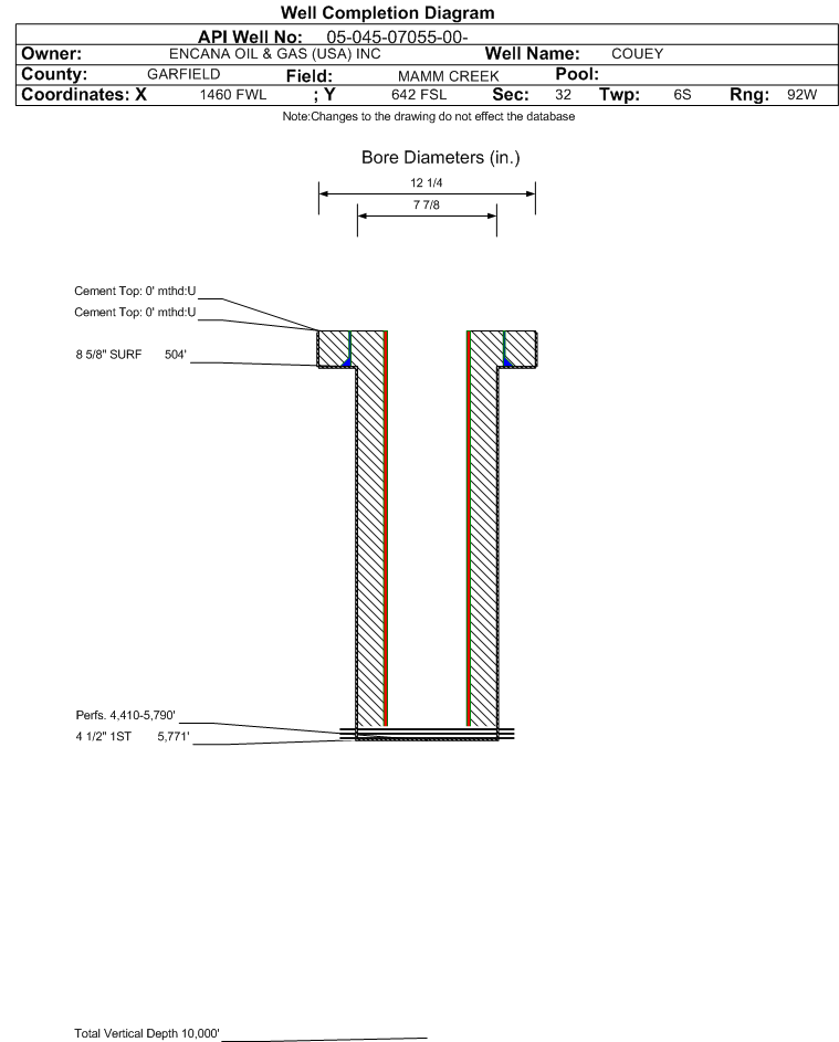 | Wellbore Completed | | Completion Date: | 4/11/1996 | | Measured TD: | 5790 ft. | Measured PB depth: | 5652 ft. | | True Vertical TD: | 0 ft. | True Vertical PB depth: | | | Casing: | String Type: SURF, Hole Size: 12.25 in., Size: 8.625 in., Top: 0 ft., Depth: 504 ft., Weight: 24# , Citings Type: ACTUAL | | Cement: | Sacks: 350, Top: 0 ft., Bottom: 504 ft., Determination Method: CALC | | Casing: | String Type: 1ST, Hole Size: 7.875 in., Size: 4.5 in., Top: 0 ft., Depth: 5771 ft., Weight: 11.6# , Citings Type: ACTUAL | | Cement: | Sacks: 830, Top: 1800 ft., Bottom: 5771 ft., Determination Method: CALC | | Formation | Interval Top | Log Bottom | Cored | DSTs | | WILLIAMS FORK | 4410 ft. | | | |