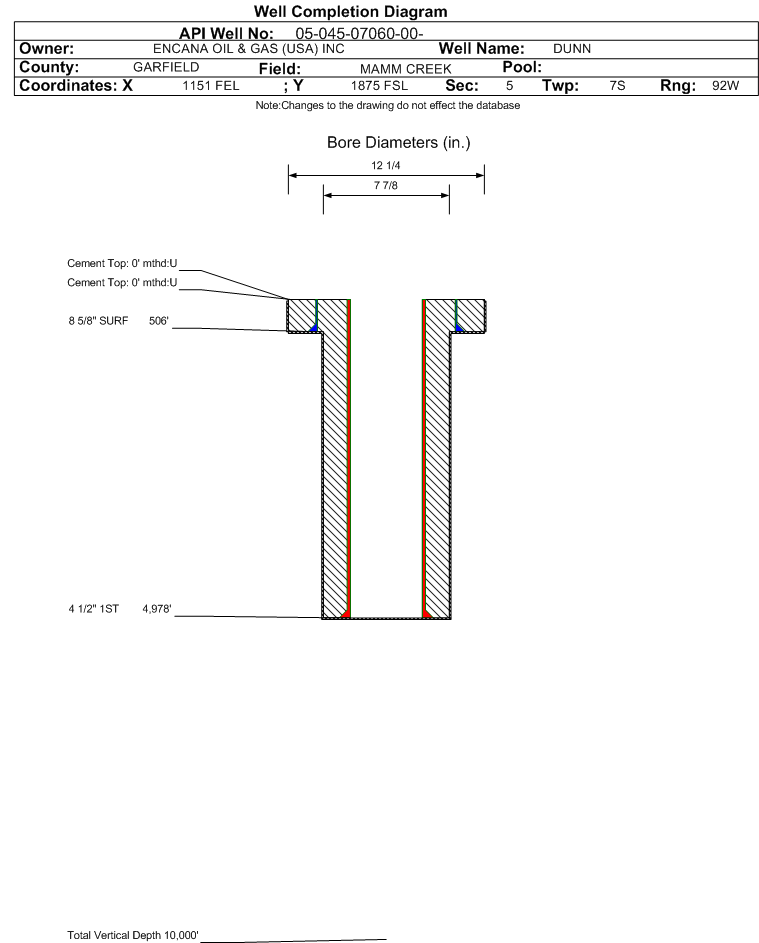 | Wellbore Completed | | Completion Date: | 4/28/1996 | | Measured TD: | 4980 ft. | Measured PB depth: | 4905 ft. | | True Vertical TD: | 0 ft. | True Vertical PB depth: | | | Casing: | String Type: SURF, Hole Size: 12.25 in., Size: 8.625 in., Top: 0 ft., Depth: 506 ft., Weight: , Citings Type: HISTORICAL | | Cement: | Sacks: 350, Top: 0 ft., Bottom: , Determination Method: | | Casing: | String Type: 1ST, Hole Size: 7.875 in., Size: 4.5 in., Top: 0 ft., Depth: 4978 ft., Weight: , Citings Type: HISTORICAL | | Cement: | Sacks: 0, Top: 0 ft., Bottom: , Determination Method: |