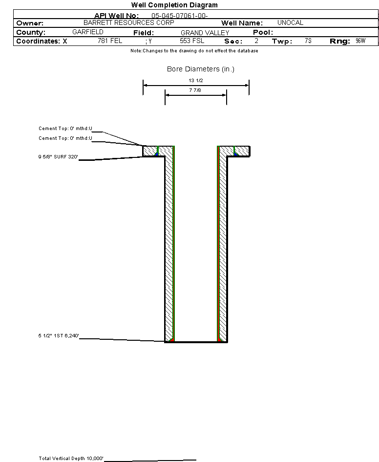 | Wellbore Completed | | Completion Date: | 3/11/1999 | | Measured TD: | 6274 ft. | Measured PB depth: | 6240 ft. | | True Vertical TD: | 0 ft. | True Vertical PB depth: | | | Casing: | String Type: SURF, Hole Size: 13.5 in., Size: 9.625 in., Top: 0 ft., Depth: 320 ft., Weight: , Citings Type: HISTORICAL | | Cement: | Sacks: 175, Top: 0 ft., Bottom: , Determination Method: | | Casing: | String Type: 1ST, Hole Size: 7.875 in., Size: 5.5 in., Top: 0 ft., Depth: 6240 ft., Weight: , Citings Type: HISTORICAL | | Cement: | Sacks: 0, Top: 0 ft., Bottom: , Determination Method: | | Formation | Interval Top | Log Bottom | Cored | DSTs | | FORT UNION | 1687 ft. | | | | | MESAVERDE | 3152 ft. | | | | | CAMEO COAL | 5648 ft. | | | | | ROLLINS | 6171 ft. | | | |
