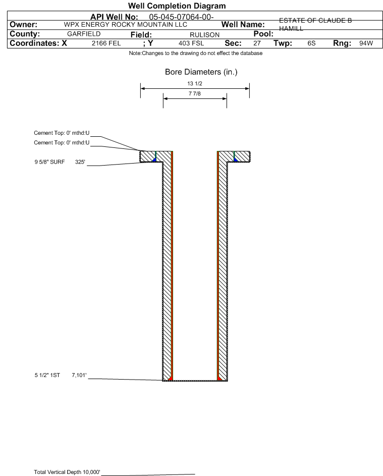 | Wellbore Completed | | Completion Date: | 11/7/1996 | | Measured TD: | 7100 ft. | Measured PB depth: | 0 ft. | | True Vertical TD: | 0 ft. | True Vertical PB depth: | | | Casing: | String Type: SURF, Hole Size: 13.5 in., Size: 9.625 in., Top: 0 ft., Depth: 325 ft., Weight: 36 , Citings Type: ACTUAL | | Cement: | Sacks: 190, Top: 0 ft., Bottom: 325 ft., Determination Method: VISU | | Casing: | String Type: 1ST, Hole Size: 7.875 in., Size: 5.5 in., Top: 0 ft., Depth: 7101 ft., Weight: 17 , Citings Type: ACTUAL | | Cement: | Sacks: 1250, Top: 4270 ft., Bottom: 4270 ft., Determination Method: CBL | | Formation | Interval Top | Log Bottom | Cored | DSTs | | MESAVERDE | 3795 ft. | | | | | CAMEO COAL | 6482 ft. | | | |