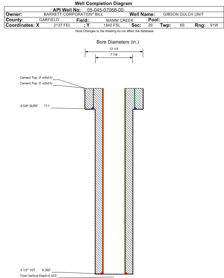 | Wellbore Completed | | Completion Date: | 10/15/1996 | | Spud Date: | 6/28/1996 | Spud Date Is: | ACTUAL | | Measured TD: | 6690 ft. | Measured PB depth: | 6610 ft. | | True Vertical TD: | 6453 ft. | True Vertical PB depth: | | | Casing: | String Type: SURF, Hole Size: 12.25 in., Size: 8.625 in., Top: 0 ft., Depth: 711 ft., Weight: , Citings Type: HISTORICAL | | Cement: | Sacks: 400, Top: 0 ft., Bottom: , Determination Method: | | Casing: | String Type: 1ST, Hole Size: 7.875 in., Size: 4.5 in., Top: 0 ft., Depth: 6350 ft., Weight: , Citings Type: HISTORICAL | | Cement: | Sacks: 0, Top: 0 ft., Bottom: , Determination Method: | | Formation | Interval Top | Log Bottom | Cored | DSTs | | MESAVERDE | 3535 ft. | | | |