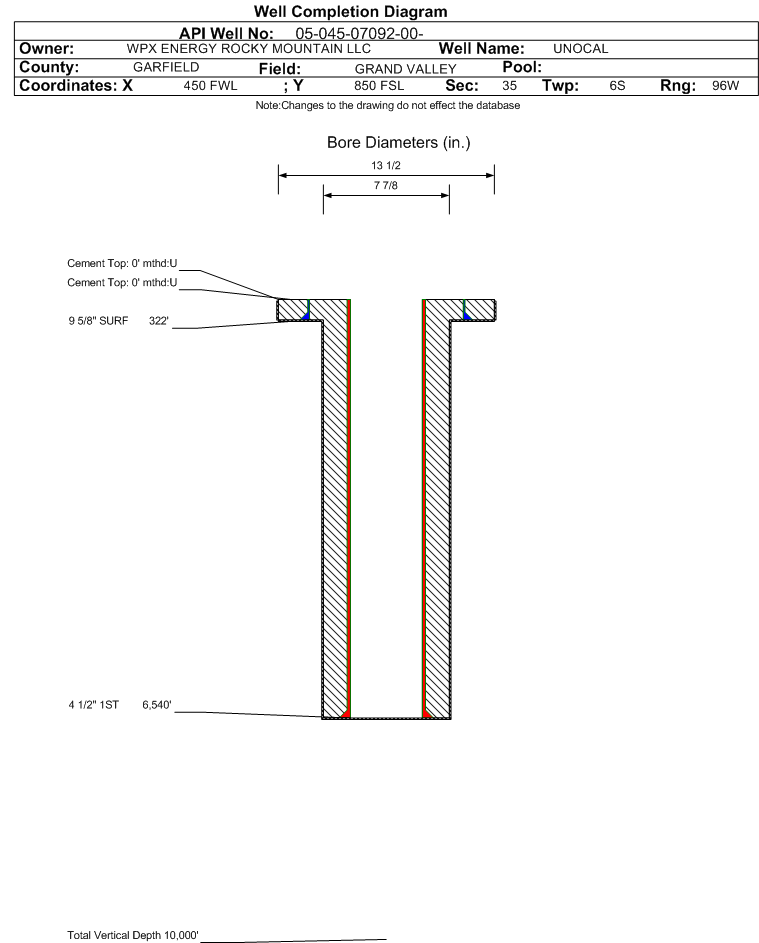 | Wellbore Completed | | Completion Date: | 2/24/1997 | | Measured TD: | 6550 ft. | Measured PB depth: | 0 ft. | | True Vertical TD: | 0 ft. | True Vertical PB depth: | | | Casing: | String Type: SURF, Hole Size: 13.5 in., Size: 9.625 in., Top: 0 ft., Depth: 322 ft., Weight: , Citings Type: HISTORICAL | | Cement: | Sacks: 150, Top: 0 ft., Bottom: , Determination Method: | | Casing: | String Type: 1ST, Hole Size: 7.875 in., Size: 4.5 in., Top: 0 ft., Depth: 6540 ft., Weight: , Citings Type: HISTORICAL | | Cement: | Sacks: 0, Top: 0 ft., Bottom: , Determination Method: | | Formation | Interval Top | Log Bottom | Cored | DSTs | | FORT UNION | 1967 ft. | | | | | MESAVERDE | 3380 ft. | | | | | CAMEO COAL | 5974 ft. | | | |