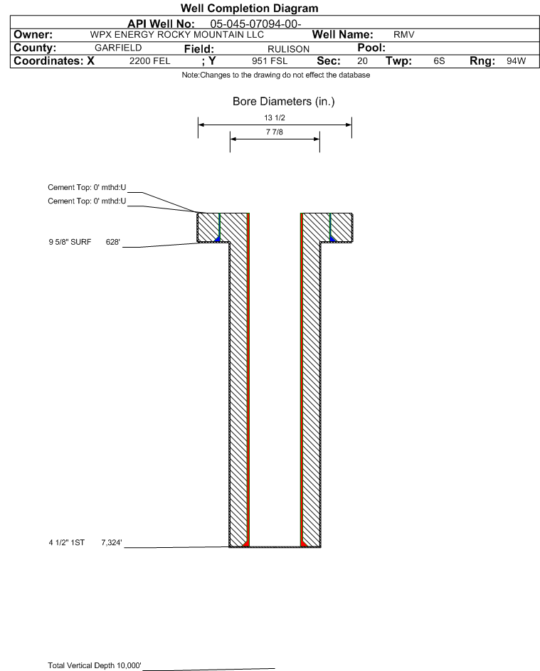| Wellbore Completed | | Completion Date: | N/A | | Measured TD: | 7330 ft. | Measured PB depth: | 0 ft. | | True Vertical TD: | 0 ft. | True Vertical PB depth: | | | Casing: | String Type: SURF, Hole Size: 13.5 in., Size: 9.625 in., Top: 0 ft., Depth: 628 ft., Weight: , Citings Type: HISTORICAL | | Cement: | Sacks: 325, Top: 0 ft., Bottom: , Determination Method: | | Casing: | String Type: 1ST, Hole Size: 7.875 in., Size: 4.5 in., Top: 0 ft., Depth: 7324 ft., Weight: , Citings Type: HISTORICAL | | Cement: | Sacks: 0, Top: 0 ft., Bottom: , Determination Method: | | Formation | Interval Top | Log Bottom | Cored | DSTs | | MESAVERDE | 4173 ft. | | | | | CAMEO COAL | 6794 ft. | | | |