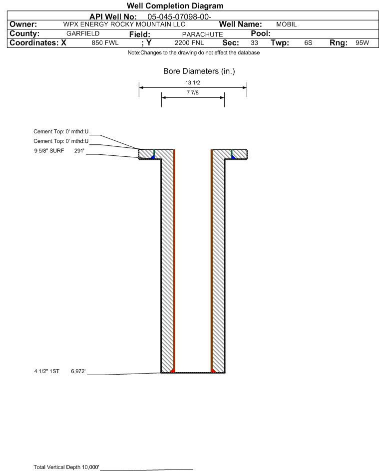 | Wellbore Completed | | Completion Date: | 3/10/1997 | | Measured TD: | 6978 ft. | Measured PB depth: | 0 ft. | | True Vertical TD: | 0 ft. | True Vertical PB depth: | | | Casing: | String Type: SURF, Hole Size: 13.5 in., Size: 9.625 in., Top: 0 ft., Depth: 291 ft., Weight: , Citings Type: HISTORICAL | | Cement: | Sacks: 150, Top: 0 ft., Bottom: , Determination Method: | | Casing: | String Type: 1ST, Hole Size: 7.875 in., Size: 4.5 in., Top: 0 ft., Depth: 6972 ft., Weight: , Citings Type: HISTORICAL | | Cement: | Sacks: 0, Top: 0 ft., Bottom: , Determination Method: | | Formation | Interval Top | Log Bottom | Cored | DSTs | | FORT UNION | 1810 ft. | | | | | MESAVERDE | 3473 ft. | | | | | CAMEO COAL | 6300 ft. | | | | | ROLLINS | 6854 ft. | | | |