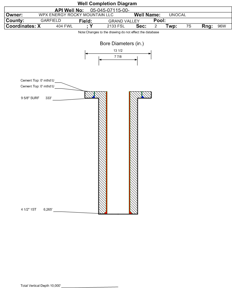 Wellbore #00 Wellbore Classification: GW Status: PR - 5/8/1997 Measured TD: 6271 ft. Vertical TD: 0 ft.| Wellbore Data for Original Wellbore | Wellbore Classification: GW PR - 5/8/1997 | | Wellbore Permit | | | Permit #: | 960802 | Expiration Date: | 11/6/1997 | | Proposed Depth/Form: | | | Surface Mineral Owner Same: | Not available | | Mineral Owner: | FEE | Surface Owner: | Not available | | Unit: | | Unit Number: | | | Formation And Spacing: | Code: WFCM , Formation: WILLIAMS FORK - CAMEO , Order: 510 , Unit Acreage: 160, Drill Unit: SW4 |