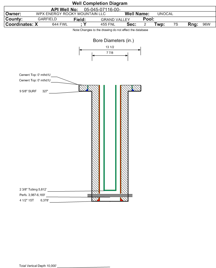 | Wellbore Completed | | Completion Date: | 6/24/1997 | | Measured TD: | 6385 ft. | Measured PB depth: | 0 ft. | | True Vertical TD: | 0 ft. | True Vertical PB depth: | | | Casing: | String Type: SURF, Hole Size: 13.5 in., Size: 9.625 in., Top: 0 ft., Depth: 327 ft., Weight: , Citings Type: HISTORICAL | | Cement: | Sacks: 200, Top: 0 ft., Bottom: , Determination Method: | | Casing: | String Type: 1ST, Hole Size: 7.875 in., Size: 4.5 in., Top: 0 ft., Depth: 6378 ft., Weight: , Citings Type: HISTORICAL | | Cement: | Sacks: 0, Top: 0 ft., Bottom: , Determination Method: | | Formation | Interval Top | Log Bottom | Cored | DSTs | | FORT UNION | 1858 ft. | | | | | MESAVERDE | 3290 ft. | | | | | CAMEO COAL | 5844 ft. | | | | | ROLLINS | 6284 ft. | | | |