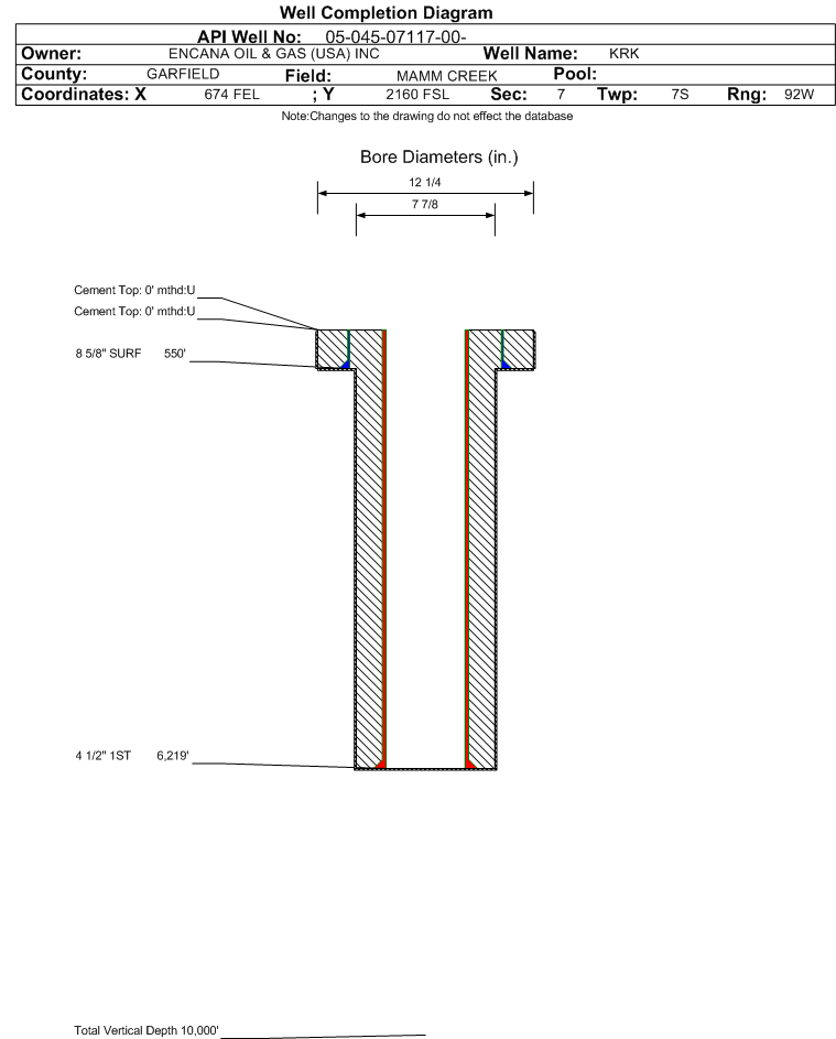 | Wellbore Completed | | Completion Date: | 2/8/1997 | | Measured TD: | 6221 ft. | Measured PB depth: | 6174 ft. | | True Vertical TD: | 0 ft. | True Vertical PB depth: | | | Casing: | String Type: SURF, Hole Size: 12.25 in., Size: 8.625 in., Top: 0 ft., Depth: 550 ft., Weight: , Citings Type: HISTORICAL | | Cement: | Sacks: 350, Top: 0 ft., Bottom: , Determination Method: | | Casing: | String Type: 1ST, Hole Size: 7.875 in., Size: 4.5 in., Top: 0 ft., Depth: 6219 ft., Weight: , Citings Type: HISTORICAL | | Cement: | Sacks: 0, Top: 0 ft., Bottom: , Determination Method: | | Formation | Interval Top | Log Bottom | Cored | DSTs | | OHIO CREEK | 2800 ft. | | | |