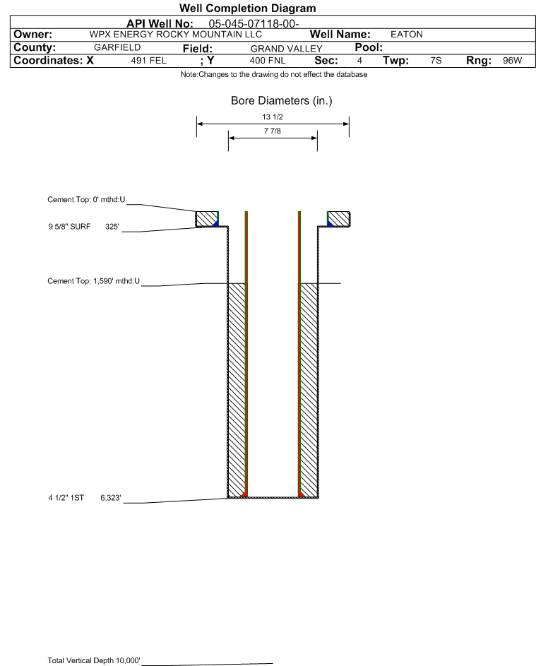 | Wellbore Completed | | Completion Date: | 7/24/1997 | | Measured TD: | 6329 ft. | Measured PB depth: | 0 ft. | | True Vertical TD: | 0 ft. | True Vertical PB depth: | | | Casing: | String Type: SURF, Hole Size: 13.5 in., Size: 9.625 in., Top: 0 ft., Depth: 325 ft., Weight: 36 , Citings Type: ACTUAL | | Cement: | Sacks: 200, Top: 0 ft., Bottom: 325 ft., Determination Method: VISU | | Casing: | String Type: 1ST, Hole Size: 7.875 in., Size: 4.5 in., Top: 0 ft., Depth: 6323 ft., Weight: 11.6&12.6, Citings Type: ACTUAL | | Cement: | Sacks: 1150, Top: 1590 ft., Bottom: 6323 ft., Determination Method: CBL | | Formation | Interval Top | Log Bottom | Cored | DSTs | | FORT SCOTT | 1960 ft. | | | | | MESAVERDE | 3311 ft. | | | | | CAMEO COAL | 5810 ft. | | | | | ROLLINS | 6300 ft. | | | |