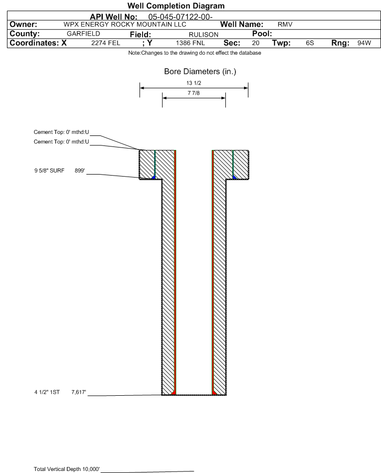 | Wellbore Completed | | Completion Date: | N/A | | Measured TD: | 7623 ft. | Measured PB depth: | 0 ft. | | True Vertical TD: | 0 ft. | True Vertical PB depth: | | | Casing: | String Type: SURF, Hole Size: 13.5 in., Size: 9.625 in., Top: 0 ft., Depth: 899 ft., Weight: , Citings Type: HISTORICAL | | Cement: | Sacks: 550, Top: 0 ft., Bottom: , Determination Method: | | Casing: | String Type: 1ST, Hole Size: 7.875 in., Size: 4.5 in., Top: 0 ft., Depth: 7617 ft., Weight: , Citings Type: HISTORICAL | | Cement: | Sacks: 0, Top: 0 ft., Bottom: , Determination Method: | | Formation | Interval Top | Log Bottom | Cored | DSTs | | MESAVERDE | 4391 ft. | | | | | CAMEO COAL | 7110 ft. | | | |