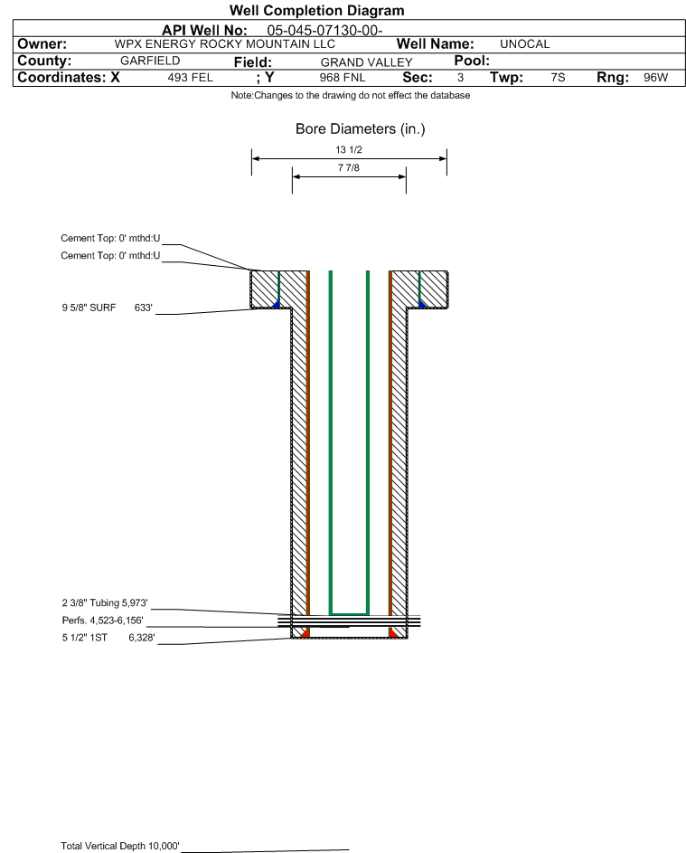 | Wellbore Completed | | Completion Date: | 3/26/1998 | | Measured TD: | 6338 ft. | Measured PB depth: | 0 ft. | | True Vertical TD: | 0 ft. | True Vertical PB depth: | | | Casing: | String Type: SURF, Hole Size: 13.5 in., Size: 9.625 in., Top: 0 ft., Depth: 633 ft., Weight: , Citings Type: HISTORICAL | | Cement: | Sacks: 350, Top: 0 ft., Bottom: , Determination Method: | | Casing: | String Type: 1ST, Hole Size: 7.875 in., Size: 5.5 in., Top: 0 ft., Depth: 6328 ft., Weight: , Citings Type: HISTORICAL | | Cement: | Sacks: 0, Top: 0 ft., Bottom: , Determination Method: | | Formation | Interval Top | Log Bottom | Cored | DSTs | | MESAVERDE | 3218 ft. | | | | | CAMEO COAL | 5736 ft. | | | | | ROLLINS | 6226 ft. | | | |