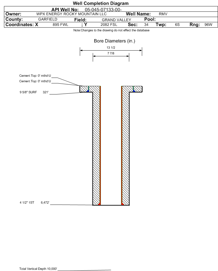 | Wellbore Completed | | Completion Date: | N/A | | Measured TD: | 6478 ft. | Measured PB depth: | 0 ft. | | True Vertical TD: | 0 ft. | True Vertical PB depth: | | | Casing: | String Type: SURF, Hole Size: 13.5 in., Size: 9.625 in., Top: 0 ft., Depth: 321 ft., Weight: , Citings Type: HISTORICAL | | Cement: | Sacks: 175, Top: 0 ft., Bottom: , Determination Method: | | Casing: | String Type: 1ST, Hole Size: 7.875 in., Size: 4.5 in., Top: 0 ft., Depth: 6472 ft., Weight: , Citings Type: HISTORICAL | | Cement: | Sacks: 0, Top: 0 ft., Bottom: , Determination Method: | | Formation | Interval Top | Log Bottom | Cored | DSTs | | FORT UNION | 1983 ft. | | | | | MESAVERDE | 3348 ft. | | | | | CAMEO COAL | 5870 ft. | | | | | ROLLINS | 6371 ft. | | | |