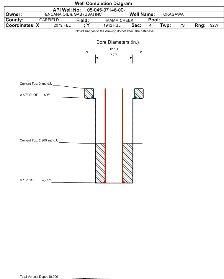| Wellbore Completed | | Completion Date: | 3/14/1997 | | Spud Date: | 2/16/1997 | Spud Date Is: | ACTUAL | | Measured TD: | 4977 ft. | Measured PB depth: | 4938 ft. | | True Vertical TD: | 0 ft. | True Vertical PB depth: | | | Casing: | String Type: SURF, Hole Size: 12.25 in., Size: 8.625 in., Top: 0 ft., Depth: 506 ft., Weight: , Citings Type: HISTORICAL | | Cement: | Sacks: 350, Top: 0 ft., Bottom: 506 ft., Determination Method: | | Casing: | String Type: 1ST, Hole Size: 7.875 in., Size: 3.5 in., Top: 0 ft., Depth: 4977 ft., Weight: , Citings Type: HISTORICAL | | Cement: | Sacks: 650, Top: 2900 ft., Bottom: 4977 ft., Determination Method: | | Formation | Interval Top | Log Bottom | Cored | DSTs | | OHIO CREEK | 2386 ft. | | | |