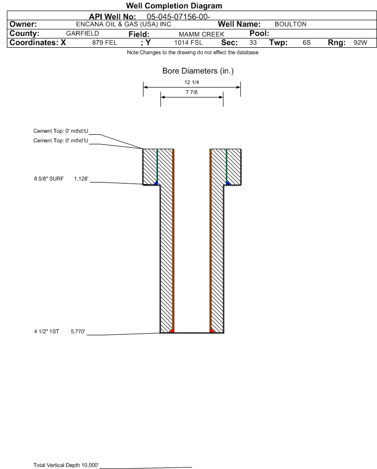 | Wellbore Completed | | Completion Date: | 12/23/1997 | | Measured TD: | 5812 ft. | Measured PB depth: | 5770 ft. | | True Vertical TD: | 0 ft. | True Vertical PB depth: | | | Casing: | String Type: SURF, Hole Size: 12.25 in., Size: 8.625 in., Top: 0 ft., Depth: 1128 ft., Weight: , Citings Type: HISTORICAL | | Cement: | Sacks: 800, Top: 0 ft., Bottom: , Determination Method: | | Casing: | String Type: 1ST, Hole Size: 7.875 in., Size: 4.5 in., Top: 0 ft., Depth: 5770 ft., Weight: , Citings Type: HISTORICAL | | Cement: | Sacks: 0, Top: 0 ft., Bottom: , Determination Method: | | Formation | Interval Top | Log Bottom | Cored | DSTs | | OHIO CREEK | 2510 ft. | | | | | WILLIAMS FORK | 2700 ft. | | | | | MESAVERDE | 2700 ft. | | | | | COAL | 5672 ft. | | | |