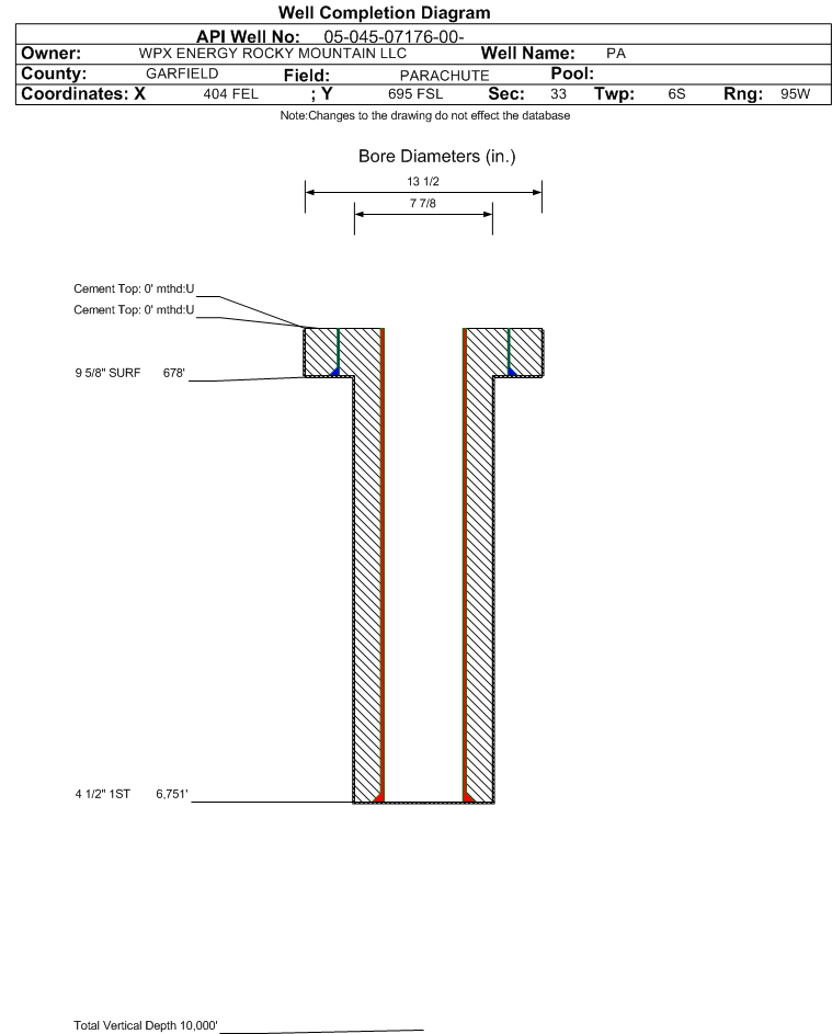 | Wellbore Completed | | Completion Date: | 2/9/1998 | | Measured TD: | 6761 ft. | Measured PB depth: | 0 ft. | | True Vertical TD: | 0 ft. | True Vertical PB depth: | | | Casing: | String Type: SURF, Hole Size: 13.5 in., Size: 9.625 in., Top: 0 ft., Depth: 678 ft., Weight: , Citings Type: HISTORICAL | | Cement: | Sacks: 325, Top: 0 ft., Bottom: , Determination Method: | | Casing: | String Type: 1ST, Hole Size: 7.875 in., Size: 4.5 in., Top: 0 ft., Depth: 6751 ft., Weight: , Citings Type: HISTORICAL | | Cement: | Sacks: 0, Top: 0 ft., Bottom: , Determination Method: | | Formation | Interval Top | Log Bottom | Cored | DSTs | | MESAVERDE | 3359 ft. | | | | | CAMEO COAL | 6120 ft. | | | | | ROLLINS | 6657 ft. | | | |