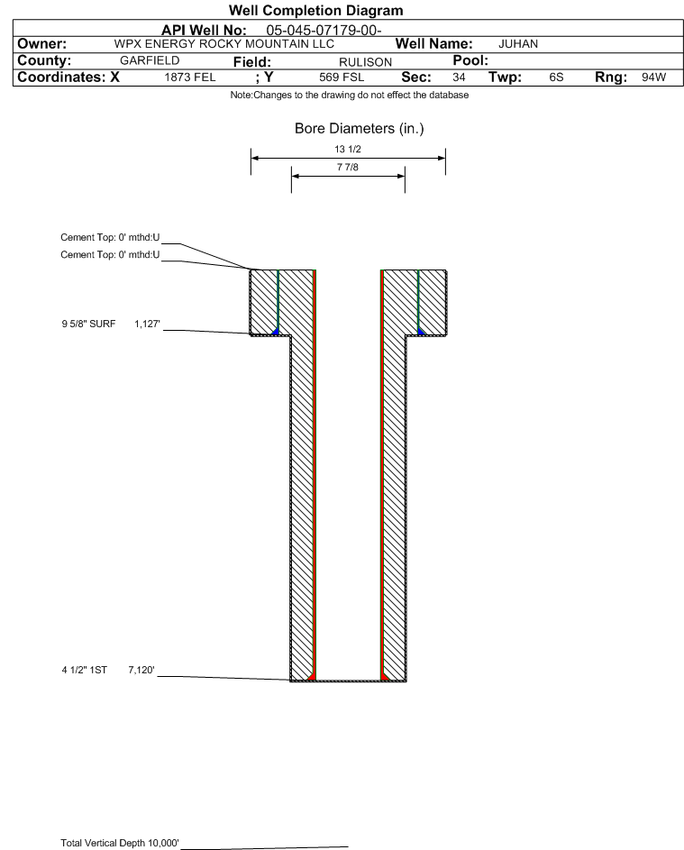 | Wellbore Completed | | Completion Date: | 1/18/1998 | | Measured TD: | 7125 ft. | Measured PB depth: | 0 ft. | | True Vertical TD: | 0 ft. | True Vertical PB depth: | | | Casing: | String Type: SURF, Hole Size: 13.5 in., Size: 9.625 in., Top: 0 ft., Depth: 1127 ft., Weight: , Citings Type: HISTORICAL | | Cement: | Sacks: 575, Top: 0 ft., Bottom: , Determination Method: | | Casing: | String Type: 1ST, Hole Size: 7.875 in., Size: 4.5 in., Top: 0 ft., Depth: 7120 ft., Weight: , Citings Type: HISTORICAL | | Cement: | Sacks: 0, Top: 0 ft., Bottom: , Determination Method: | | Formation | Interval Top | Log Bottom | Cored | DSTs | | MESAVERDE | 4052 ft. | | | | | CAMEO COAL | 6762 ft. | | | |