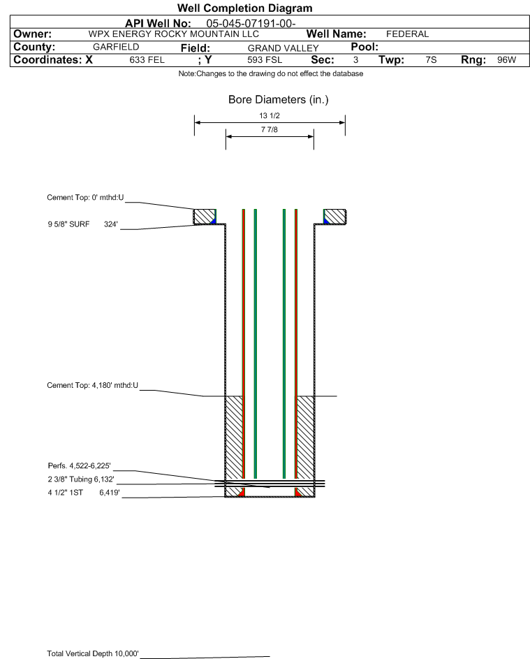 Wellbore #00 Wellbore Classification: CBM Status: PR - 1/1/2018 Measured TD: 6424 ft. Vertical TD: 0 ft.| Wellbore Data for Original Wellbore | Wellbore Classification: CBM PR - 1/1/2018 | | Wellbore Permit | | | Permit #: | 970439 | Expiration Date: | 6/15/1998 | | Proposed Depth/Form: | | | Surface Mineral Owner Same: | Not available | | Mineral Owner: | FEDERAL | Surface Owner: | Not available | | Unit: | | Unit Number: | COC24603 | | Formation And Spacing: | Code: WFCM , Formation: WILLIAMS FORK - CAMEO , Order: 510 , Unit Acreage: 320, Drill Unit: S2 |