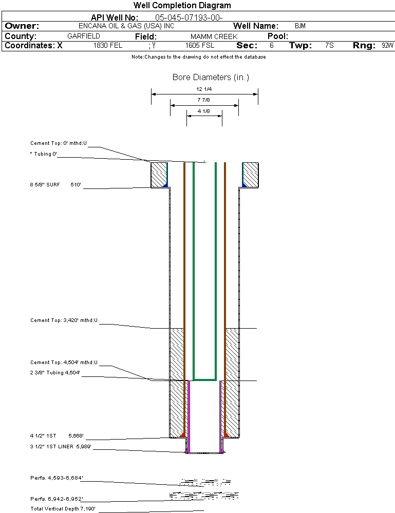 | Wellbore Completed | | Completion Date: | 7/13/2006 | | Spud Date: | 6/25/2005 | Spud Date Is: | ACTUAL | | Measured TD: | 7190 ft. | Measured PB depth: | 7156 ft. | | True Vertical TD: | | True Vertical PB depth: | | | Log Types: | CBL, RST | | Casing: | String Type: SURF, Hole Size: 12.25 in., Size: 8.625 in., Top: 0 ft., Depth: 510 ft., Weight: , Citings Type: ACTUAL | | Cement: | Sacks: 350, Top: 0 ft., Bottom: 510 ft., Determination Method: CALC | | Casing: | String Type: 1ST, Hole Size: 7.875 in., Size: 4.5 in., Top: 0 ft., Depth: 5668 ft., Weight: , Citings Type: ACTUAL | | Cement: | Sacks: 710, Top: 3420 ft., Bottom: 5668 ft., Determination Method: CBL | | Casing: | String Type: 1ST LINER, Hole Size: 4.125 in., Size: 3.5 in., Top: 4504 ft., Depth: 5989 ft., Weight: , Citings Type: ACTUAL | | Cement: | Sacks: , Top: 4504 ft., Bottom: 5989 ft., Determination Method: CALC | | Formation | Interval Top | Log Bottom | Cored | DSTs | | WASATCH | 0 ft. | 3136 ft. | N | N | | OHIO CREEK | 2890 ft. | | | | | MESAVERDE | 3167 ft. | 3774 ft. | N | N | | WILLIAMS FORK | 3775 ft. | 6890 ft. | N | N | | SHALE | 4330 ft. | | | | | ROLLINS | 6891 ft. | 7190 ft. | N | N |