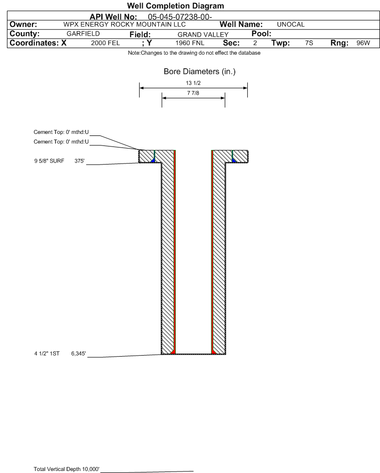 | Wellbore Completed | | Completion Date: | 3/31/1998 | | Measured TD: | 6360 ft. | Measured PB depth: | 0 ft. | | True Vertical TD: | 0 ft. | True Vertical PB depth: | | | Casing: | String Type: SURF, Hole Size: 13.5 in., Size: 9.625 in., Top: 0 ft., Depth: 375 ft., Weight: , Citings Type: HISTORICAL | | Cement: | Sacks: 375, Top: 0 ft., Bottom: , Determination Method: | | Casing: | String Type: 1ST, Hole Size: 7.875 in., Size: 4.5 in., Top: 0 ft., Depth: 6345 ft., Weight: , Citings Type: HISTORICAL | | Cement: | Sacks: 0, Top: 0 ft., Bottom: , Determination Method: | | Formation | Interval Top | Log Bottom | Cored | DSTs | | MESAVERDE | 3258 ft. | | | | | CAMEO COAL | 5756 ft. | | | | | ROLLINS | 6269 ft. | | | |