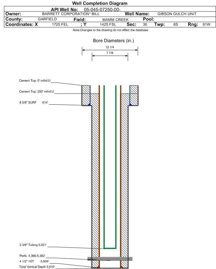 Wellbore #00 Wellbore Classification: GW Status: PR - 9/1/2004 Measured TD: 5610 ft. Vertical TD: 5610 ft.| Wellbore Data for Original Wellbore | Wellbore Classification: GW PR - 9/1/2004 | | Wellbore Permit | | | Permit #: | 001136 | Expiration Date: | 10/17/2001 | | Proposed Depth/Form: | 5400 ft. | | Surface Mineral Owner Same: | Yes | | Mineral Owner: | FEE | Surface Owner: | FEE | | Unit: | GIBSON GULCH | Unit Number: | | | Formation And Spacing: | Code: WMFK , Formation: WILLIAMS FORK , Order: , Unit Acreage: , Drill Unit: |