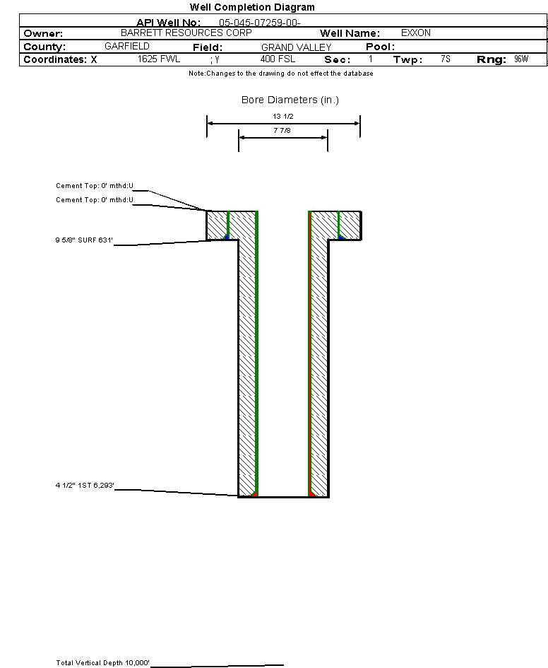 | Wellbore Completed | | Completion Date: | 11/25/1998 | | Spud Date: | 5/24/1998 | Spud Date Is: | ACTUAL | | Measured TD: | 6315 ft. | Measured PB depth: | 0 ft. | | True Vertical TD: | 0 ft. | True Vertical PB depth: | | | Casing: | String Type: SURF, Hole Size: 13.5 in., Size: 9.625 in., Top: 0 ft., Depth: 631 ft., Weight: , Citings Type: HISTORICAL | | Cement: | Sacks: 350, Top: 0 ft., Bottom: , Determination Method: | | Casing: | String Type: 1ST, Hole Size: 7.875 in., Size: 4.5 in., Top: 0 ft., Depth: 6293 ft., Weight: , Citings Type: HISTORICAL | | Cement: | Sacks: 0, Top: 0 ft., Bottom: , Determination Method: | | Formation | Interval Top | Log Bottom | Cored | DSTs | | FORT UNION | 1703 ft. | | | | | MESAVERDE | 3215 ft. | | | | | CAMEO COAL | 5732 ft. | | | | | ROLLINS | 6217 ft. | | | |