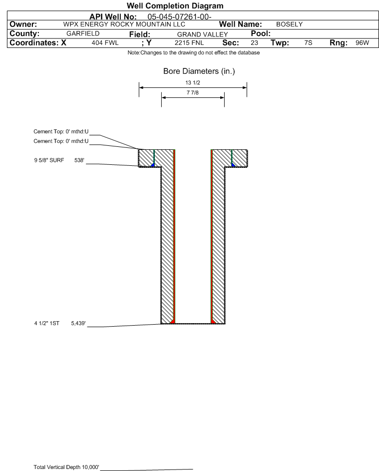 | Wellbore Completed | | Completion Date: | 6/1/1998 | | Measured TD: | 5449 ft. | Measured PB depth: | 0 ft. | | True Vertical TD: | 0 ft. | True Vertical PB depth: | | | Casing: | String Type: SURF, Hole Size: 13.5 in., Size: 9.625 in., Top: 0 ft., Depth: 538 ft., Weight: , Citings Type: HISTORICAL | | Cement: | Sacks: 325, Top: 0 ft., Bottom: , Determination Method: | | Casing: | String Type: 1ST, Hole Size: 7.875 in., Size: 4.5 in., Top: 0 ft., Depth: 5439 ft., Weight: , Citings Type: HISTORICAL | | Cement: | Sacks: 0, Top: 0 ft., Bottom: , Determination Method: | | Formation | Interval Top | Log Bottom | Cored | DSTs | | MESAVERDE | 2528 ft. | | | | | CAMEO COAL | 4870 ft. | | | | | ROLLINS | 5328 ft. | | | |
