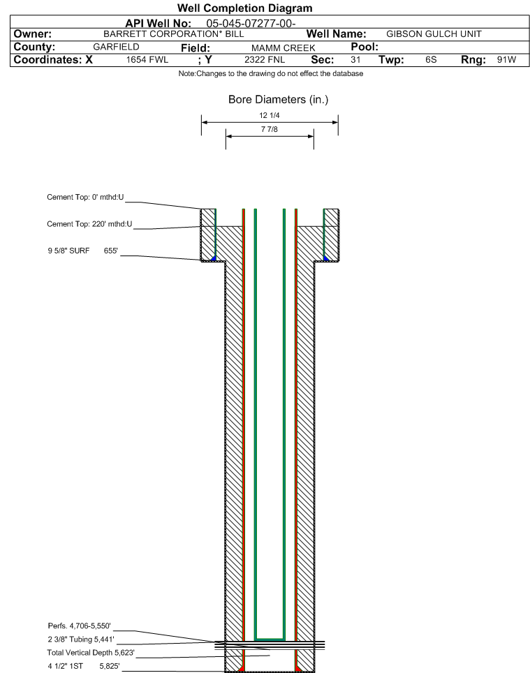 Wellbore #00 Wellbore Classification: GW Status: PR - 7/16/2009 Measured TD: 5825 ft. Vertical TD: 5623 ft.| Wellbore Data for Original Wellbore | Wellbore Classification: GW PR - 7/16/2009 | | Wellbore Permit | DIRECTIONAL | | Permit #: | 000926 | Expiration Date: | 8/29/2001 | | Proposed Top PZ Location: | Sec:31 Twp: 6S 91W | Footage: 1355 FNL 2105 FWL | | Bottom Hole Location: | Sec:31 Twp: 6S 91W | Footage: 1355 FNL 2105 FSL | | Proposed Depth/Form: | 5500 ft. | | Surface Mineral Owner Same: | No | | Mineral Owner: | FEE | Surface Owner: | FEE | | Unit: | GIBSON GULCH | Unit Number: | | | Formation And Spacing: | Code: WMFK , Formation: WILLIAMS FORK , Order: , Unit Acreage: , Drill Unit: |