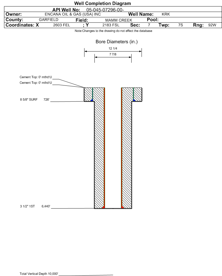 | Wellbore Completed | | Completion Date: | 5/22/1998 | | Measured TD: | 6426 ft. | Measured PB depth: | 6395 ft. | | True Vertical TD: | 0 ft. | True Vertical PB depth: | | | Casing: | String Type: SURF, Hole Size: 12.25 in., Size: 8.625 in., Top: 0 ft., Depth: 726 ft., Weight: , Citings Type: HISTORICAL | | Cement: | Sacks: 500, Top: 0 ft., Bottom: , Determination Method: | | Casing: | String Type: 1ST, Hole Size: 7.875 in., Size: 3.5 in., Top: 0 ft., Depth: 6440 ft., Weight: , Citings Type: HISTORICAL | | Cement: | Sacks: 0, Top: 0 ft., Bottom: , Determination Method: | | Formation | Interval Top | Log Bottom | Cored | DSTs | | MESAVERDE | 3290 ft. | | | | | WILLIAMS FORK | 3290 ft. | | | |