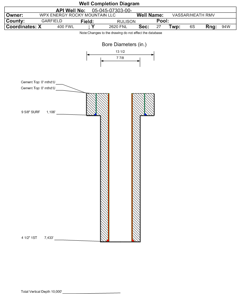 | Wellbore Completed | | Completion Date: | 9/11/1998 | | Measured TD: | 7348 ft. | Measured PB depth: | 0 ft. | | True Vertical TD: | 0 ft. | True Vertical PB depth: | | | Casing: | String Type: SURF, Hole Size: 13.5 in., Size: 9.625 in., Top: 0 ft., Depth: 1106 ft., Weight: , Citings Type: HISTORICAL | | Cement: | Sacks: 525, Top: 0 ft., Bottom: , Determination Method: | | Casing: | String Type: 1ST, Hole Size: 7.875 in., Size: 4.5 in., Top: 0 ft., Depth: 7433 ft., Weight: , Citings Type: HISTORICAL | | Cement: | Sacks: 0, Top: 0 ft., Bottom: , Determination Method: | | Formation | Interval Top | Log Bottom | Cored | DSTs | | MESAVERDE | 3988 ft. | | | | | CAMEO COAL | 6731 ft. | | | |