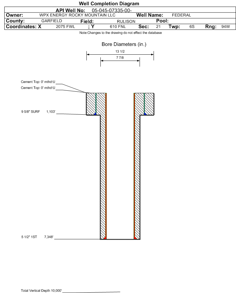 | Wellbore Completed | | Completion Date: | N/A | | Measured TD: | 7450 ft. | Measured PB depth: | 7348 ft. | | True Vertical TD: | 0 ft. | True Vertical PB depth: | | | Casing: | String Type: SURF, Hole Size: 13.5 in., Size: 9.625 in., Top: 0 ft., Depth: 1103 ft., Weight: , Citings Type: HISTORICAL | | Cement: | Sacks: 550, Top: 0 ft., Bottom: , Determination Method: | | Casing: | String Type: 1ST, Hole Size: 7.875 in., Size: 5.5 in., Top: 0 ft., Depth: 7348 ft., Weight: , Citings Type: HISTORICAL | | Cement: | Sacks: 0, Top: 0 ft., Bottom: , Determination Method: | | Formation | Interval Top | Log Bottom | Cored | DSTs | | MESAVERDE | 4255 ft. | | | | | CAMEO COAL | 7037 ft. | | | |