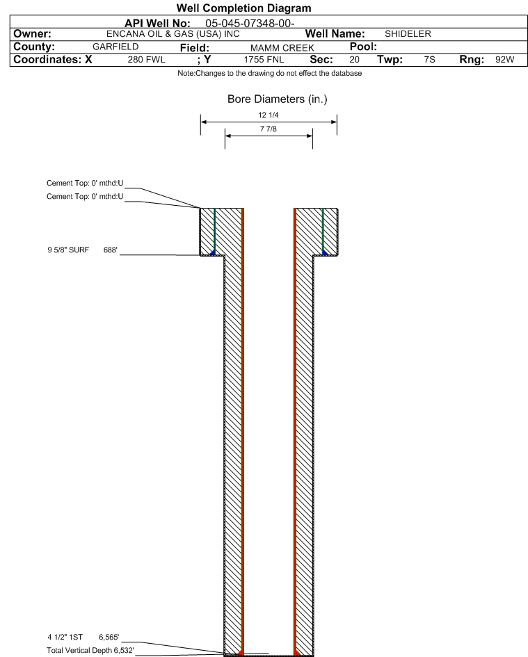 | Wellbore Completed | | Completion Date: | 1/30/1999 | | Spud Date: | 1/15/1999 | Spud Date Is: | ACTUAL | | Measured TD: | 6565 ft. | Measured PB depth: | 0 ft. | | True Vertical TD: | 6532 ft. | True Vertical PB depth: | | | Casing: | String Type: SURF, Hole Size: 12.25 in., Size: 9.625 in., Top: 0 ft., Depth: 688 ft., Weight: , Citings Type: HISTORICAL | | Cement: | Sacks: 350, Top: 0 ft., Bottom: , Determination Method: | | Casing: | String Type: 1ST, Hole Size: 7.875 in., Size: 4.5 in., Top: 0 ft., Depth: 6565 ft., Weight: , Citings Type: HISTORICAL | | Cement: | Sacks: 0, Top: 0 ft., Bottom: , Determination Method: | | Formation | Interval Top | Log Bottom | Cored | DSTs | | WILLIAMS FORK | 3290 ft. | | | | | COAL | 6170 ft. | | | |