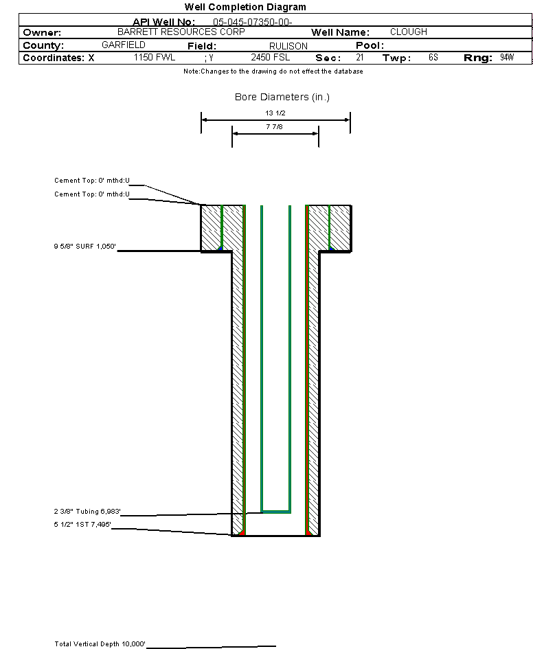| Wellbore Completed | | Completion Date: | 3/6/1999 | | Spud Date: | 2/10/1999 | Spud Date Is: | ACTUAL | | Measured TD: | 7501 ft. | Measured PB depth: | 0 ft. | | True Vertical TD: | 0 ft. | True Vertical PB depth: | 0 ft. | | Top PZ Location: | Sec: Twp: | Footage: 0 FL 0 FL | | Casing: | String Type: SURF, Hole Size: 13.5 in., Size: 9.625 in., Top: 0 ft., Depth: 1050 ft., Weight: , Citings Type: HISTORICAL | | Cement: | Sacks: 535, Top: 0 ft., Bottom: , Determination Method: | | Casing: | String Type: 1ST, Hole Size: 7.875 in., Size: 5.5 in., Top: 0 ft., Depth: 7495 ft., Weight: , Citings Type: HISTORICAL | | Cement: | Sacks: 985, Top: 0 ft., Bottom: , Determination Method: | | Formation | Interval Top | Log Bottom | Cored | DSTs | | MESAVERDE | 4117 ft. | | | | | CAMEO COAL | 6883 ft. | | | |