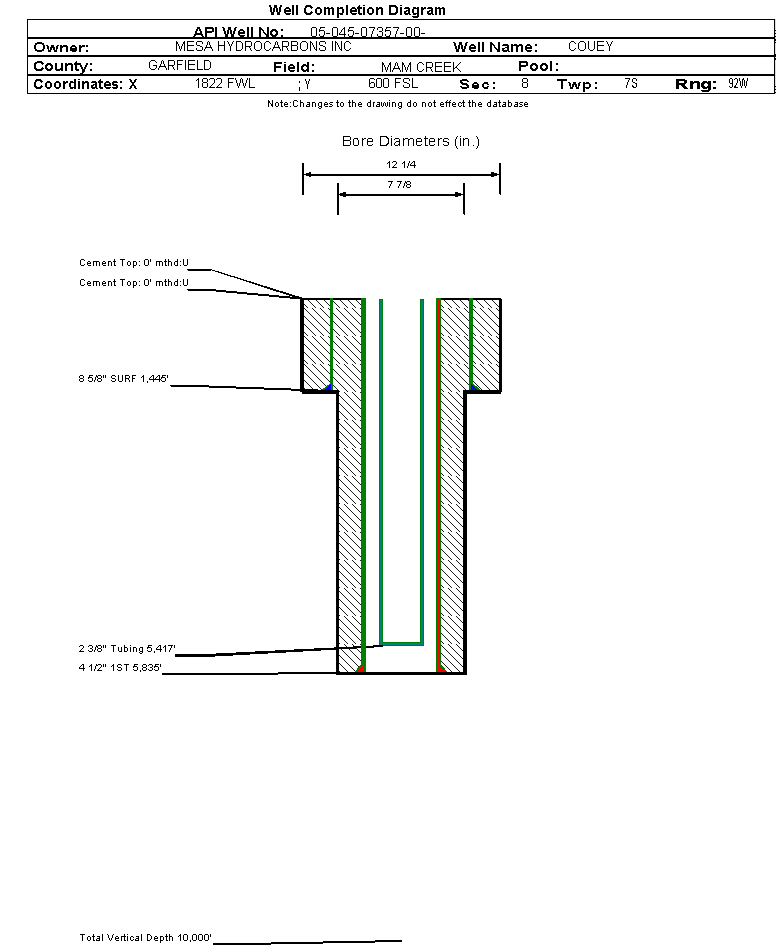 | Wellbore Completed | | Completion Date: | 4/1/1999 | | Spud Date: | 3/20/1999 | Spud Date Is: | ACTUAL | | Measured TD: | 5835 ft. | Measured PB depth: | 5835 ft. | | True Vertical TD: | 0 ft. | True Vertical PB depth: | | | Casing: | String Type: SURF, Hole Size: 12.25 in., Size: 8.625 in., Top: 0 ft., Depth: 1445 ft., Weight: , Citings Type: HISTORICAL | | Cement: | Sacks: 650, Top: 0 ft., Bottom: , Determination Method: | | Casing: | String Type: 1ST, Hole Size: 7.875 in., Size: 4.5 in., Top: 0 ft., Depth: 5835 ft., Weight: , Citings Type: HISTORICAL | | Cement: | Sacks: 0, Top: 0 ft., Bottom: , Determination Method: | | Formation | Interval Top | Log Bottom | Cored | DSTs | | WILLIAMS FORK | 2724 ft. | | | | | COAL | 5695 ft. | | | |