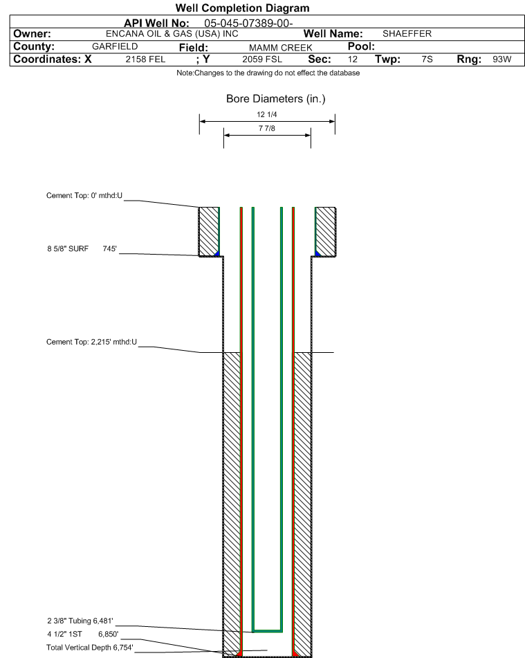 | Wellbore Completed | | Completion Date: | 3/2/2000 | | Spud Date: | 11/7/1999 | Spud Date Is: | ACTUAL | | Measured TD: | 6950 ft. | Measured PB depth: | 6835 ft. | | True Vertical TD: | 6754 ft. | True Vertical PB depth: | | | Bottom Hole Location: | Sec: Twp: | Footage: 3250 FSL 1882 FEL | | Log Types: | CN/LD/GR,AI/GR,CBL | | Log Types: | CN/LD/GR,AI/GR,CBL | | Casing: | String Type: SURF, Hole Size: 12.25 in., Size: 8.625 in., Top: , Depth: 745 ft., Weight: 24 , Citings Type: ACTUAL | | Cement: | Sacks: 360, Top: 0 ft., Bottom: 745 ft., Determination Method: VISU | | Casing: | String Type: 1ST, Hole Size: 7.875 in., Size: 4.5 in., Top: , Depth: 6850 ft., Weight: 11.6 , Citings Type: ACTUAL | | Cement: | Sacks: 900, Top: 2215 ft., Bottom: 6850 ft., Determination Method: CBL | | Formation | Interval Top | Log Bottom | Cored | DSTs | | WASATCH | 3094 ft. | 3870 ft. | N | N | | OHIO CREEK | 3870 ft. | 4580 ft. | N | N | | WILLIAMS FORK | 4580 ft. | 5090 ft. | N | N | | COAL | 6850 ft. | | N | N |