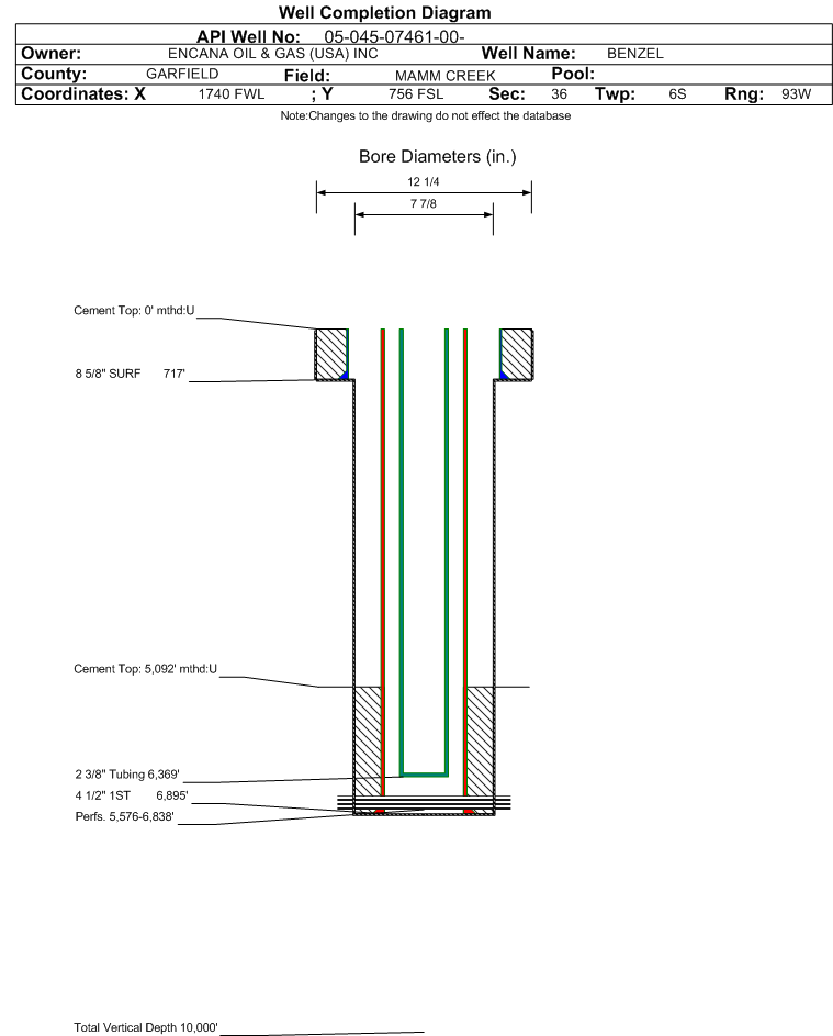 | Wellbore Completed | | Completion Date: | 4/12/2000 | | Spud Date: | 3/16/2000 | Spud Date Is: | ACTUAL | | Measured TD: | 6900 ft. | Measured PB depth: | | | True Vertical TD: | | True Vertical PB depth: | 6857 ft. | | Log Types: | AI/GR, CBL | | Casing: | String Type: SURF, Hole Size: 12.25 in., Size: 8.625 in., Top: 0 ft., Depth: 717 ft., Weight: 24 , Citings Type: ACTUAL | | Cement: | Sacks: 360, Top: 0 ft., Bottom: 717 ft., Determination Method: CALC | | Casing: | String Type: 1ST, Hole Size: 7.875 in., Size: 4.5 in., Top: 0 ft., Depth: 6895 ft., Weight: 11.6 , Citings Type: ACTUAL | | Cement: | Sacks: 790, Top: 5092 ft., Bottom: 6895 ft., Determination Method: CBL | | Formation | Interval Top | Log Bottom | Cored | DSTs | | WASATCH | 3100 ft. | 3790 ft. | N | N | | OHIO CREEK | 3790 ft. | 4462 ft. | N | N | | WILLIAMS FORK | 4462 ft. | 5058 ft. | N | N | | COAL | 6734 ft. | | N | N |