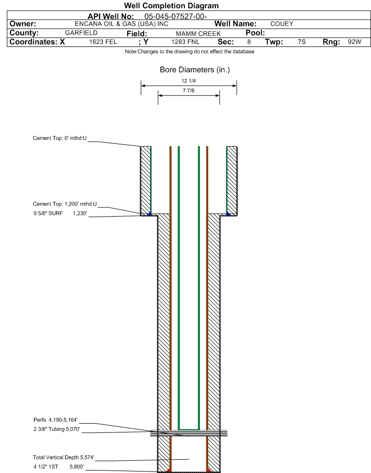 | Wellbore Completed | | Completion Date: | 6/7/2000 | | Spud Date: | 5/22/2000 | Spud Date Is: | ACTUAL | | Measured TD: | 5800 ft. | Measured PB depth: | 5753 ft. | | True Vertical TD: | 5574 ft. | True Vertical PB depth: | 5527 ft. | | Top PZ Location: | Sec: Twp: | Footage: 1980 FNL 710 FEL | | Bottom Hole Location: | Sec: Twp: | Footage: 1993 FNL 588 FEL | | Log Types: | DUAL IND, NEUT DENS. | | Casing: | String Type: SURF, Hole Size: 12.25 in., Size: 9.625 in., Top: 0 ft., Depth: 1230 ft., Weight: 36/32 , Citings Type: ACTUAL | | Cement: | Sacks: 450, Top: 0 ft., Bottom: 1230 ft., Determination Method: | | Casing: | String Type: 1ST, Hole Size: 7.875 in., Size: 4.5 in., Top: 0 ft., Depth: 5800 ft., Weight: 11.6 , Citings Type: ACTUAL | | Cement: | Sacks: 810, Top: 1200 ft., Bottom: 5800 ft., Determination Method: | | Formation | Interval Top | Log Bottom | Cored | DSTs | | WILLIAMS FORK | 2610 ft. | 5652 ft. | N | N |