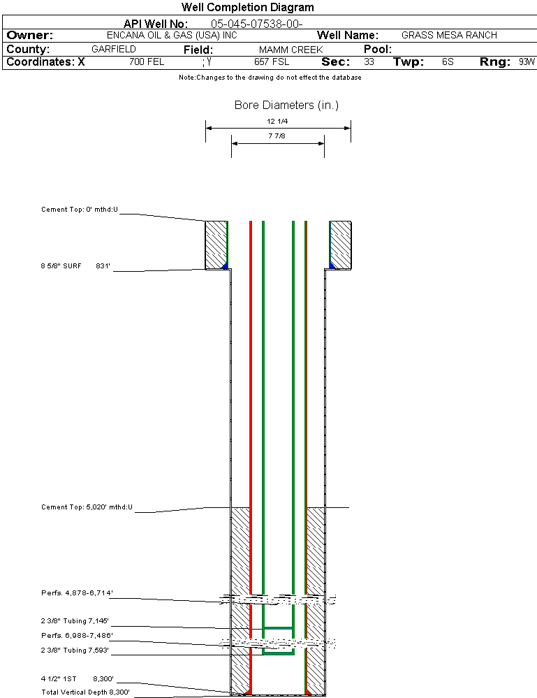 | Wellbore Completed | | Completion Date: | 12/17/2000 | | Spud Date: | 8/22/2000 | Spud Date Is: | ACTUAL | | Measured TD: | | Measured PB depth: | 8260 ft. | | True Vertical TD: | 8300 ft. | True Vertical PB depth: | | | Log Types: | CBL, TDTL/GR-CCL, CN/LD, AI | | Log Types: | CBL,TDTL/GR-CCL,CN/LD,AI | | Casing: | String Type: SURF, Hole Size: 12.25 in., Size: 8.625 in., Top: 0 ft., Depth: 831 ft., Weight: 24 , Citings Type: ACTUAL | | Cement: | Sacks: 385, Top: 0 ft., Bottom: 831 ft., Determination Method: CALC | | Casing: | String Type: 1ST, Hole Size: 7.875 in., Size: 4.5 in., Top: 0 ft., Depth: 8300 ft., Weight: 11.6 , Citings Type: ACTUAL | | Cement: | Sacks: 750, Top: 5020 ft., Bottom: 8300 ft., Determination Method: CBL | | Formation | Interval Top | Log Bottom | Cored | DSTs | | WASATCH | 4600 ft. | 5310 ft. | N | N | | OHIO CREEK | 5310 ft. | 6007 ft. | N | N | | WILLIAMS FORK | 6007 ft. | 6550 ft. | N | N |