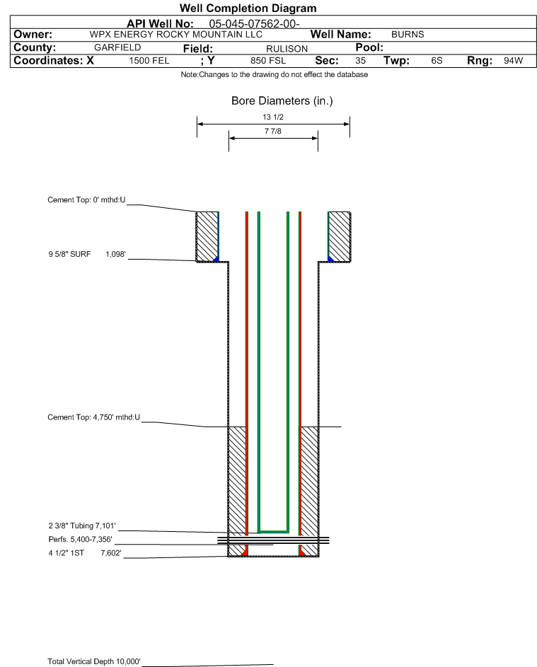 Wellbore #00 Wellbore Classification: GW Status: PR - 5/25/2000 Measured TD: 7614 ft.| Wellbore Data for Original Wellbore | Wellbore Classification: GW PR - 5/25/2000 | | Wellbore Permit | | | Permit #: | 000570 | Expiration Date: | 6/8/2001 | | Proposed Depth/Form: | 7600 ft. | | Surface Mineral Owner Same: | No | | Mineral Owner: | FEE | Surface Owner: | FEE | | Unit: | | Unit Number: | | | Formation And Spacing: | Code: WMFK , Formation: WILLIAMS FORK , Order: 139-28 , Unit Acreage: 640, Drill Unit: ALL |
