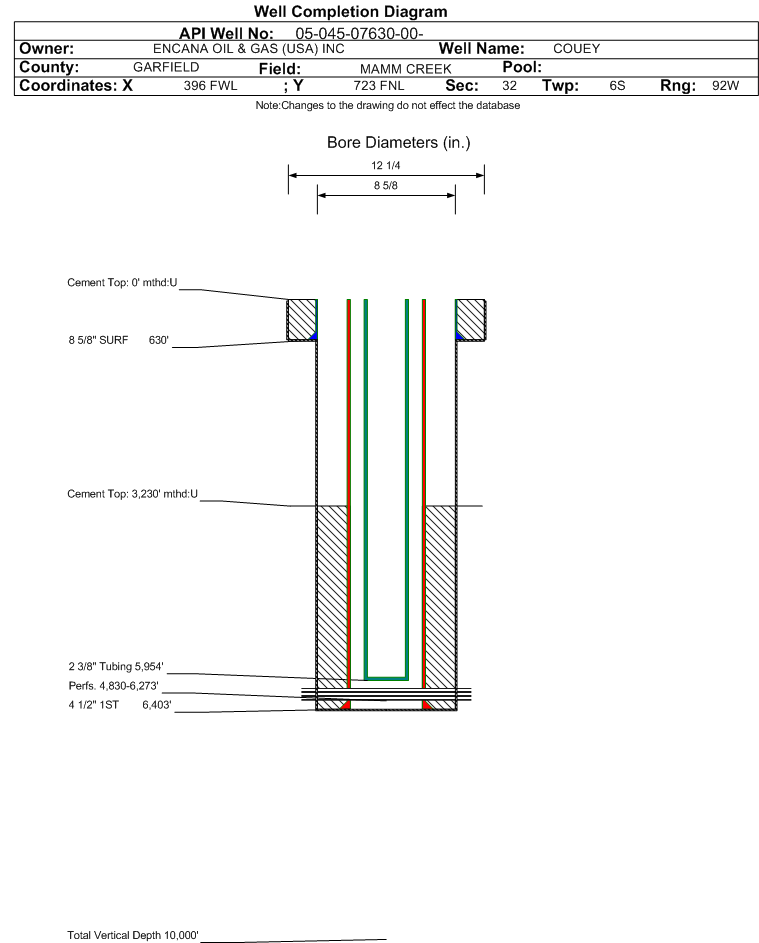 | Wellbore Completed | | Completion Date: | 4/9/2001 | | Spud Date: | 12/31/2001 | Spud Date Is: | ACTUAL | | Measured TD: | 6400 ft. | Measured PB depth: | 6326 ft. | | True Vertical TD: | | True Vertical PB depth: | | | Log Types: | | | Casing: | String Type: SURF, Hole Size: 12.25 in., Size: 8.625 in., Top: 0 ft., Depth: 630 ft., Weight: 24 , Citings Type: ACTUAL | | Cement: | Sacks: 360, Top: 0 ft., Bottom: 630 ft., Determination Method: CALC | | Casing: | String Type: 1ST, Hole Size: 8.625 in., Size: 4.5 in., Top: 0 ft., Depth: 6403 ft., Weight: 11.6 , Citings Type: ACTUAL | | Cement: | Sacks: 850, Top: 3230 ft., Bottom: 6403 ft., Determination Method: CBL | | Formation | Interval Top | Log Bottom | Cored | DSTs | | WILLIAMS FORK | 3946 ft. | | N | N |