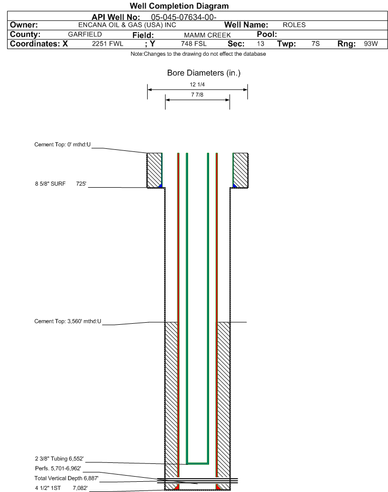 | | Perforation Data: | | Interval Top: | 5701 ft. | # Of Holes: | 78 | | Interval Bottom: | 6962 ft. | Hole Size: | |