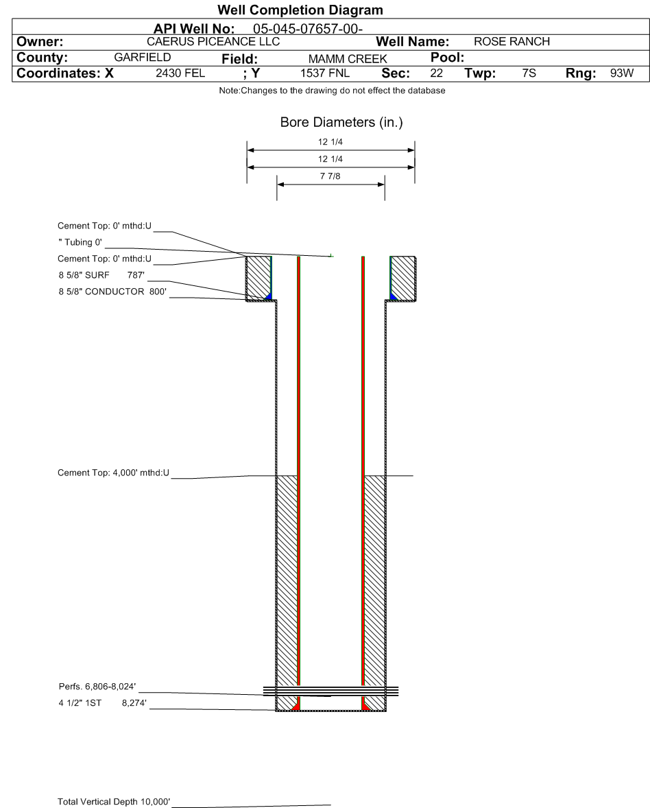 | Wellbore Completed | | Completion Date: | 7/21/2001 | | Spud Date: | 2/4/2001 | Spud Date Is: | ACTUAL | | Measured TD: | 8200 ft. | Measured PB depth: | 8166 ft. | | True Vertical TD: | | True Vertical PB depth: | | | Top PZ Location: | Sec: Twp: | Footage: 1938 FNL 829 FEL | | Bottom Hole Location: | Sec: Twp: | Footage: 1980 FNL 660 FEL | | Log Types: | CBL/CCL/GR/RST | | Casing: | String Type: CONDUCTOR, Hole Size: 12.25 in., Size: 8.625 in., Top: 0 ft., Depth: 800 ft., Weight: 24 , Citings Type: ACTUAL | | Cement: | Sacks: 435, Top: 0 ft., Bottom: 800 ft., Determination Method: CALC | | Casing: | String Type: SURF, Hole Size: 12.25 in., Size: 8.625 in., Top: 0 ft., Depth: 787 ft., Weight: 24 , Citings Type: ACTUAL | | Cement: | Sacks: 435, Top: 0 ft., Bottom: 787 ft., Determination Method: VISU | | Casing: | String Type: 1ST, Hole Size: 7.875 in., Size: 4.5 in., Top: , Depth: 8274 ft., Weight: 11.6 , Citings Type: ACTUAL | | Cement: | Sacks: 1000, Top: 4000 ft., Bottom: 8274 ft., Determination Method: CBL | | Formation | Interval Top | Log Bottom | Cored | DSTs | | WASATCH | 0 ft. | | N | N | | WILLIAMS FORK | 5672 ft. | | N | N |