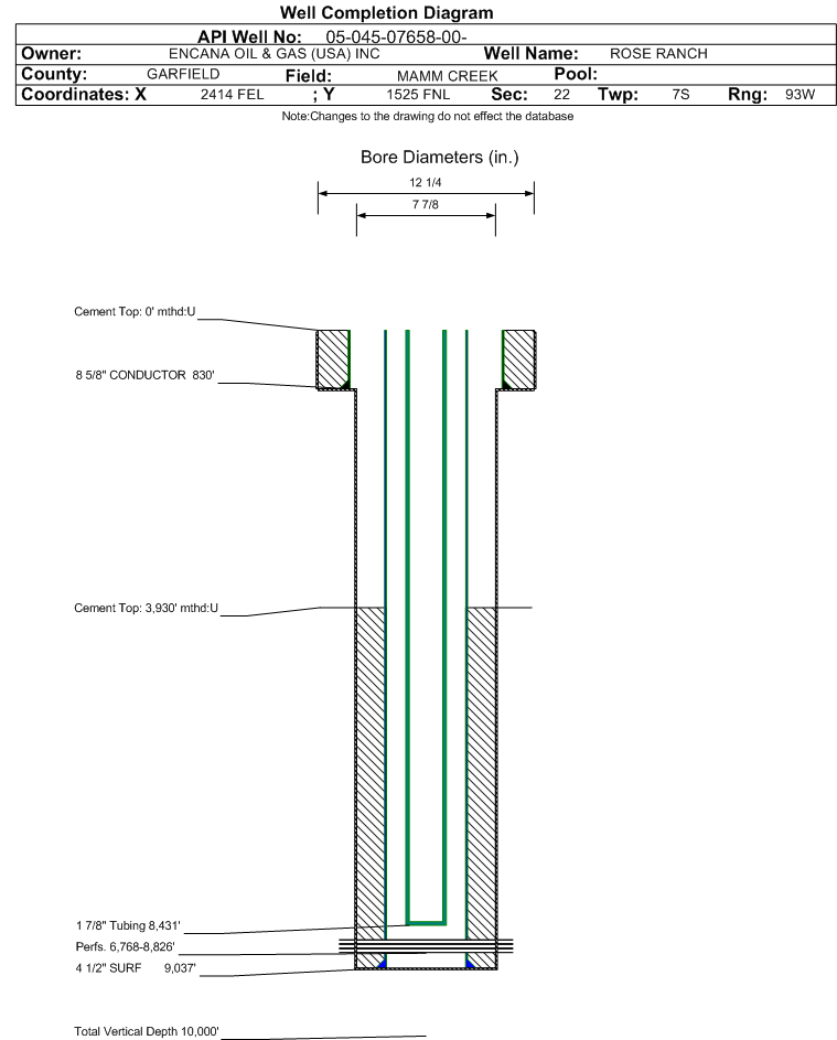 | Wellbore Completed | | Completion Date: | 7/20/2001 | | Spud Date: | 3/2/2001 | Spud Date Is: | ACTUAL | | Measured TD: | 8950 ft. | Measured PB depth: | 8851 ft. | | True Vertical TD: | | True Vertical PB depth: | | | Top PZ Location: | Sec: Twp: | Footage: 788 FNL 2044 FEL | | Bottom Hole Location: | Sec: Twp: | Footage: 660 FNL 1980 FEL | | Log Types: | CBL/CCL/GR/RST/PLATFORM EXPRESS AI/GR/SP | | Casing: | String Type: CONDUCTOR, Hole Size: 12.25 in., Size: 8.625 in., Top: 0 ft., Depth: 830 ft., Weight: 24 , Citings Type: ACTUAL | | Cement: | Sacks: 425, Top: 0 ft., Bottom: 830 ft., Determination Method: CALC | | Casing: | String Type: SURF, Hole Size: 7.875 in., Size: 4.5 in., Top: 0 ft., Depth: 9037 ft., Weight: 11.6 , Citings Type: ACTUAL | | Cement: | Sacks: 1140, Top: 3930 ft., Bottom: 9037 ft., Determination Method: CBL | | Formation | Interval Top | Log Bottom | Cored | DSTs | | WASATCH | 0 ft. | | N | N | | WILLIAMS FORK | 5840 ft. | | N | N |