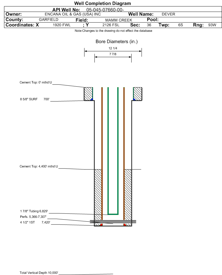 | Wellbore Completed | | Completion Date: | 7/12/2001 | | Spud Date: | 3/5/2001 | Spud Date Is: | ACTUAL | | Measured TD: | 7398 ft. | Measured PB depth: | 7360 ft. | | True Vertical TD: | | True Vertical PB depth: | | | Log Types: | AIX/GR/SP/CBL/CCL | | Casing: | String Type: SURF, Hole Size: 12.25 in., Size: 8.625 in., Top: 0 ft., Depth: 700 ft., Weight: 24 , Citings Type: ACTUAL | | Cement: | Sacks: 425, Top: 0 ft., Bottom: 700 ft., Determination Method: CALC | | Casing: | String Type: 1ST, Hole Size: 7.875 in., Size: 4.5 in., Top: 0 ft., Depth: 7420 ft., Weight: 11.6 , Citings Type: ACTUAL | | Cement: | Sacks: 900, Top: 4400 ft., Bottom: 7420 ft., Determination Method: CBL | | Formation | Interval Top | Log Bottom | Cored | DSTs | | WILLIAMS FORK | 4369 ft. | | N | N |